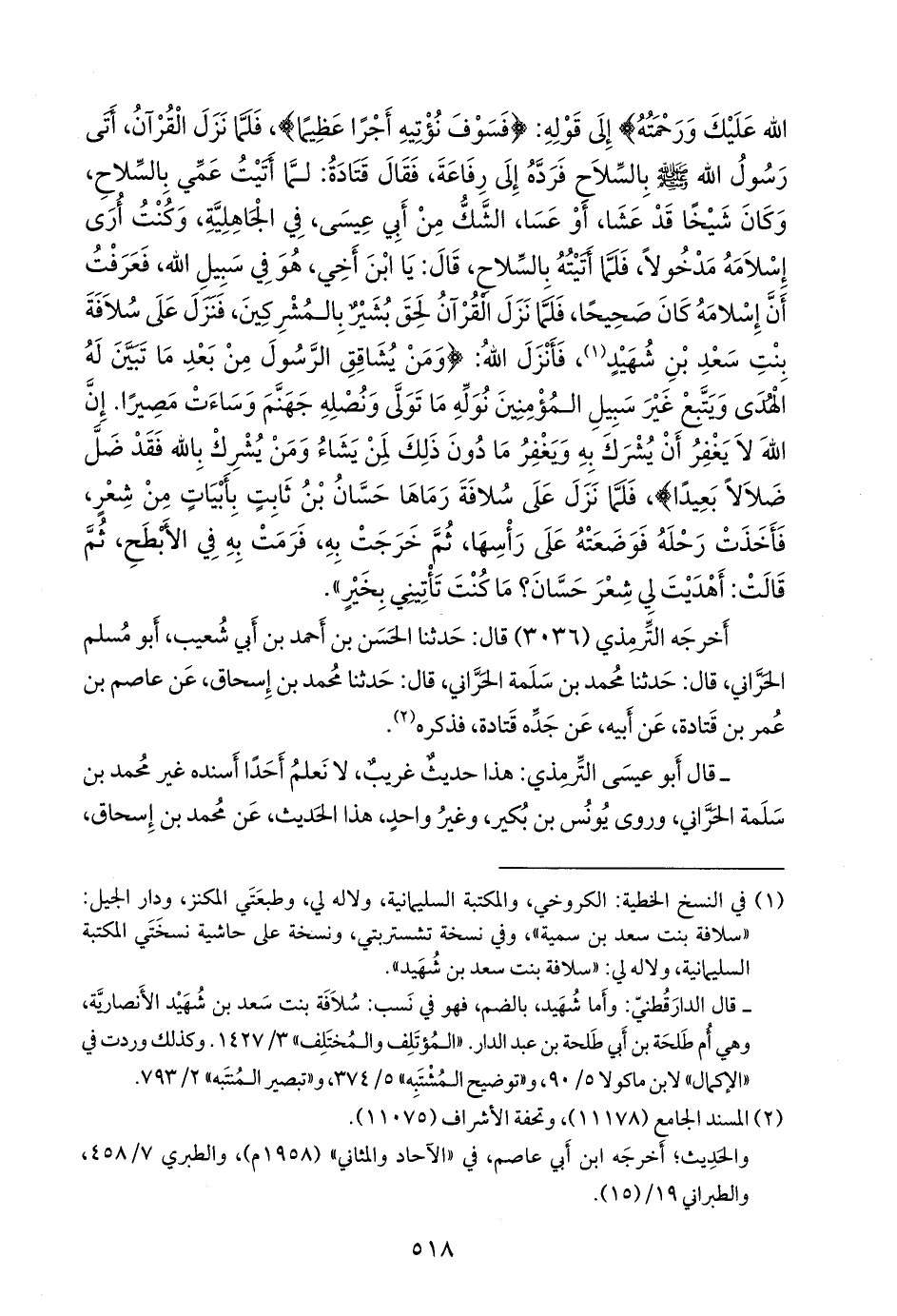 (¬١) اختلفت النسخ الخطية فاختلفت طبعات الكتاب، ففي طبعتَي دار الصِّدِّيق والتأصيل: «سلافة بنت سعد بن سُمَية»، وفي طبعة الرسالة: «سلافة بنت سعد بن شُهيد»، قال الدَّارَقطني: وأما شُهيد، بالضم، فهو في نَسَب: سلافة بنت سعد بن شُهيد الأَنصارية، وهي أم طلحة بن أبي طلحة بن عبد الدار. «المُؤتَلِف والمُختَلِف» ٣/ ١٤٢٧، وكذلك وردت في «الإكمال» لابن ماكولا ٥/ ٩٠، و «توضيح المُشتَبه» ٥/ ٣٧٤، و «تبصير المنتبه» ٢/ ٧٩٣.