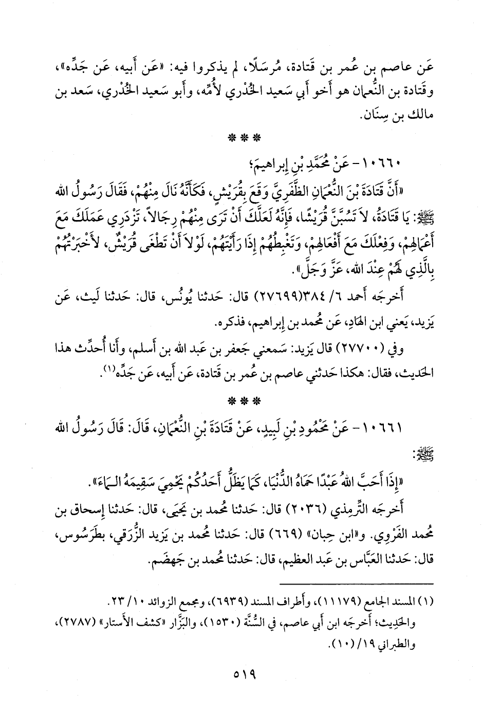 (¬١) المسند الجامع (١١١٧٩)، وأطراف المسند (٦٩٣٩)، ومَجمَع الزوائد ١٠/ ٢٣.
