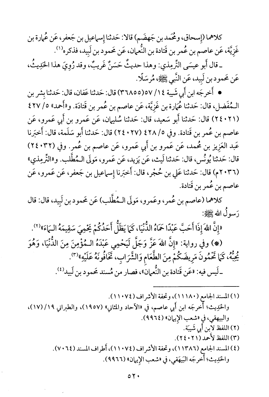 وفي ٥/ ٤٢٨ (٢٤٠٢٧) قال: حدثنا أَبو سلمة، قال: أخبرنا عبد العزيز بن محمد، عن عَمرو بن أبي عَمرو، عن عاصم بن عمر. وفي (٢٤٠٣٢) قال: حدثنا يونس، قال: حدثنا ليث، عن يزيد، عن عَمرو مولى المطلب. و «التِّرمِذي» (٢٠٣٦ م) قال: حدثنا علي بن حُجْر، قال: أخبرنا إسماعيل بن جعفر، عن عَمرو، عن عاصم بن عمر بن قتادة.
