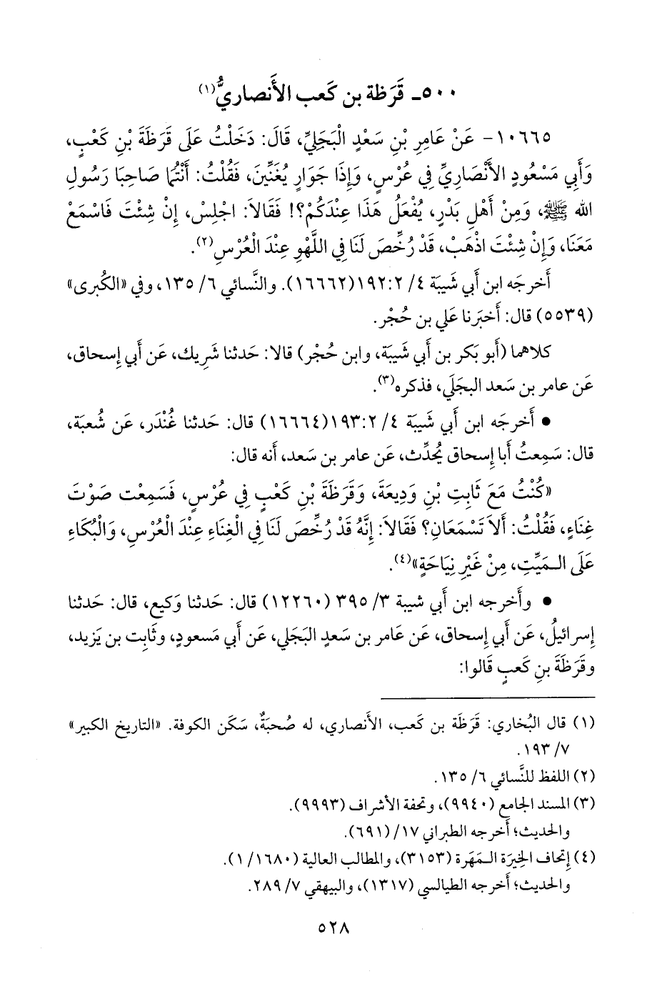 ١٠٦٦٥ - عن عامر بن سعد البَجَلي، قال: دخلت على قرظة بن كعب، وأبي مسعود الأَنصاري في عرس، وإذا جوار يغنين، فقلت: أنتما صاحبا رسول الله صَلى الله عَليه وسَلم ومن أهل بدر، يفعل هذا عندكم؟! فقالا: اجلس، إن شئت فاسمع معنا، وإن شئت اذهب، قد رخص لنا في اللهو عند العرس (¬٢).
