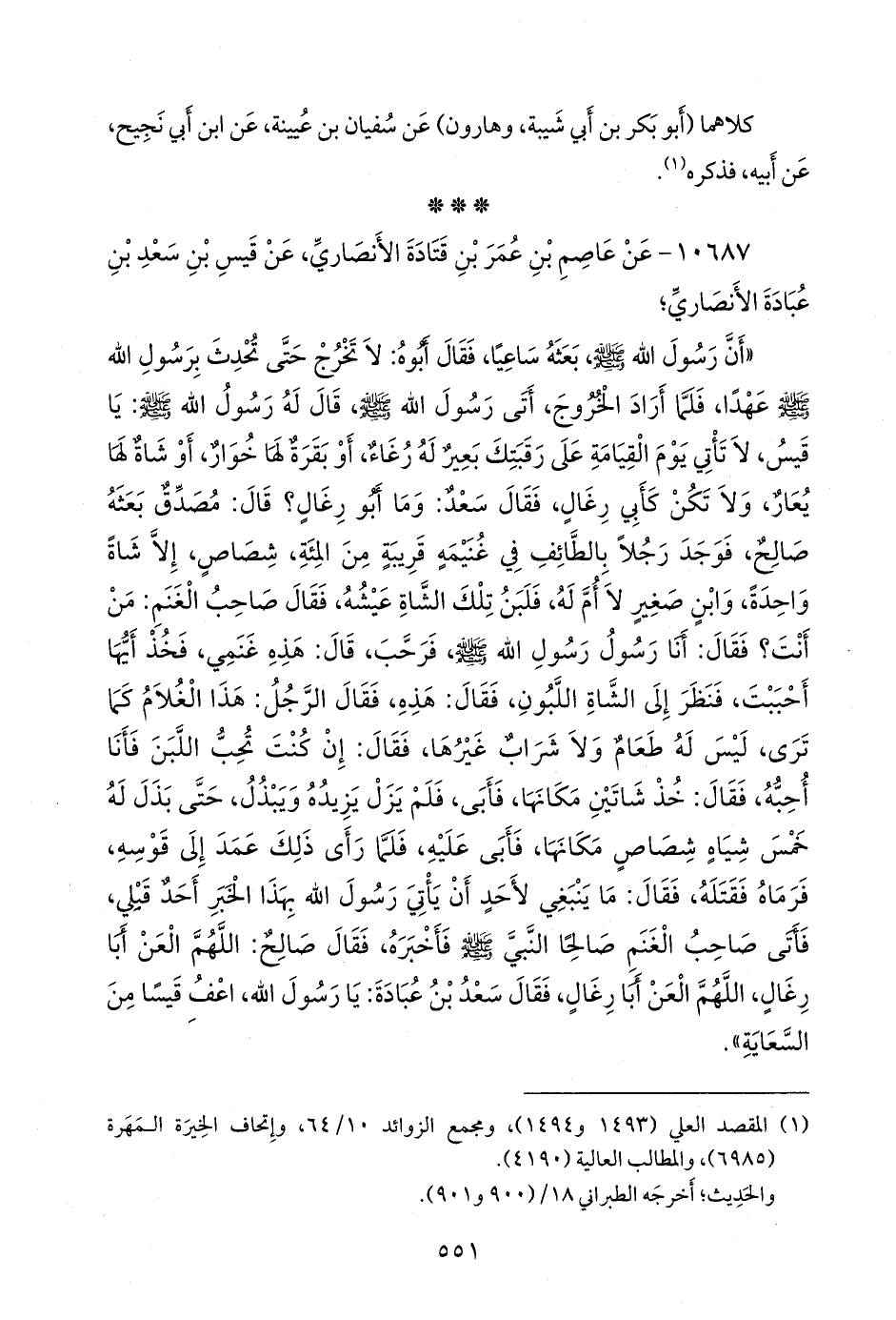 ١٠٦٨٧ - عن عاصم بن عمر بن قتادة الأَنصاري، عن قيس بن سعد بن عبادة الأَنصاري؛