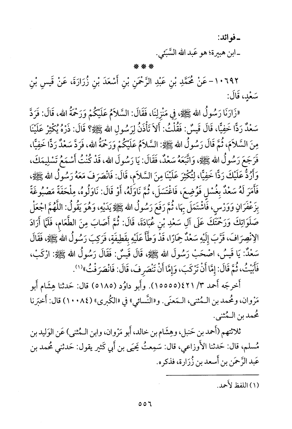 «زارنا رسول الله صَلى الله عَليه وسَلم في منزلنا، فقال: السلام عليكم ورحمة الله، قال: فرد سعد ردا خفيا، قال قيس: فقلت: ألا تأذن لرسول الله صَلى الله عَليه وسَلم؟ قال: ذره يكثر علينا من السلام، ثم قال رسول الله صَلى الله عَليه وسَلم: السلام عليكم ورحمة الله، فرد سعد ردا خفيا، فرجع رسول الله صَلى الله عَليه وسَلم واتبعه سعد، فقال: يا رسول الله، قد كنت أسمع تسليمك، وأرد عليك ردا خفيا، لتكثر علينا من السلام، قال: فانصرف معه رسول الله صَلى الله عَليه وسَلم فأمر له سعد بغسل فوضع، فاغتسل، ثم ناوله، أو قال: ناولوه، ملحفة مصبوغة بزعفران وورس، فاشتمل بها، ثم رفع رسول الله صَلى الله عَليه وسَلم يديه، وهو يقول: اللهم اجعل صلواتك ورحمتك على آل سعد بن عبادة، قال: ثم أصاب من الطعام، فلما أراد الانصراف، قرب إليه سعد حمارا، قد وطأ عليه بقطيفة، فركب رسول الله صَلى الله عَليه وسَلم فقال سعد: يا قيس، اصحب رسول الله صَلى الله عَليه وسَلم قال قيس: فقال رسول الله صَلى الله عَليه وسَلم: اركب، فأبيت، ثم قال: إما أن تركب، وإما أن تنصرف، قال: فانصرفت» (¬١).