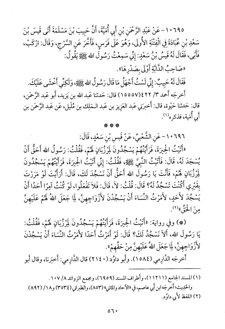 «أتيت الحيرة، فرأيتهم يسجدون لمرزبان لهم، فقلت: رسول الله أحق أن يسجد له، قال: فأتيت النبي صَلى الله عَليه وسَلم فقلت: إني أتيت الحيرة، فرأيتهم يسجدون لمرزبان لهم، فأنت يا رسول الله أحق أن نسجد لك، قال: أرأيت لو مررت بقبري أكنت تسجد له؟ قال: قلت: لا، قال: فلا تفعلوا، لو كنت آمرا أحدا أن يسجد لأحد، لأمرت النساء أن يسجدن لأزواجهن، لما جعل الله لهم عليهن من الحق» (¬١).