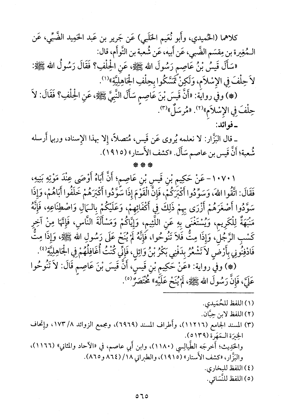 - وفي رواية: «عن حكيم بن قيس، أن قيس بن عاصم قال: لا تنوحوا علي، فإن رسول الله صَلى الله عَليه وسَلم لم ينح عليه» مختصر (¬٢).
