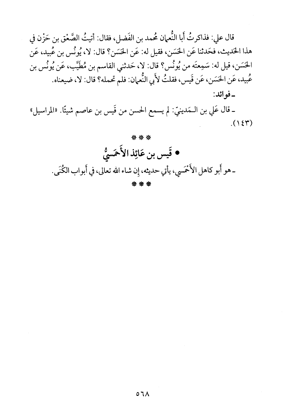 - قلنا: إِسناده ضعيفٌ؛ قال علي بن المديني: لم يسمع الحسن من قيس بن عاصم شيئا. «المراسيل» (١٤٣).