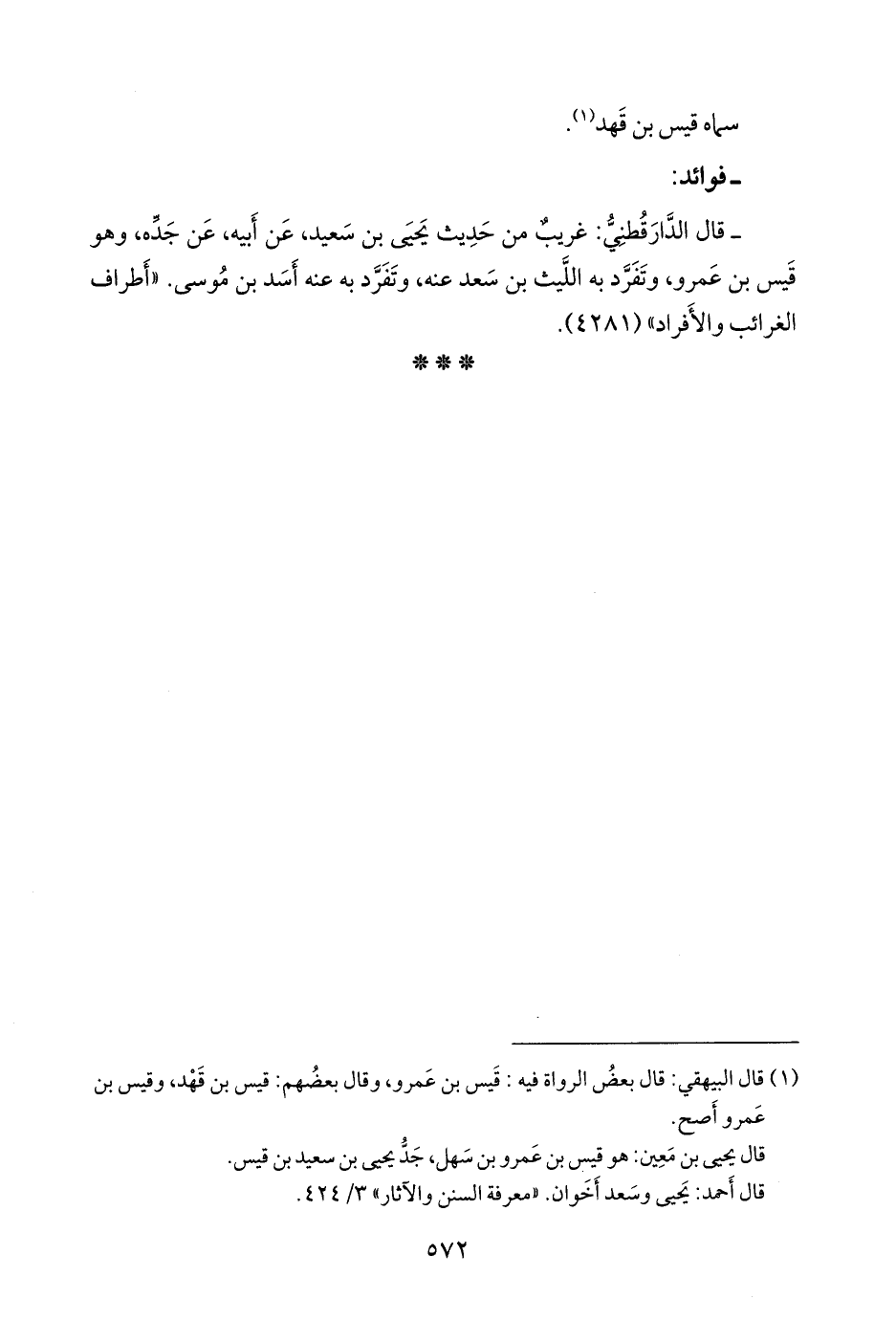 - قال الدارقُطني: غريبٌ من حديث يحيى بن سعيد، عن أبيه، عن جَدِّه، وهو قيس بن عَمرو، وتفرد به الليث بن سعد عنه، وتفرد به عنه أسد بن موسى. «أطراف الغرائب والأفراد» (٤٢٨١).