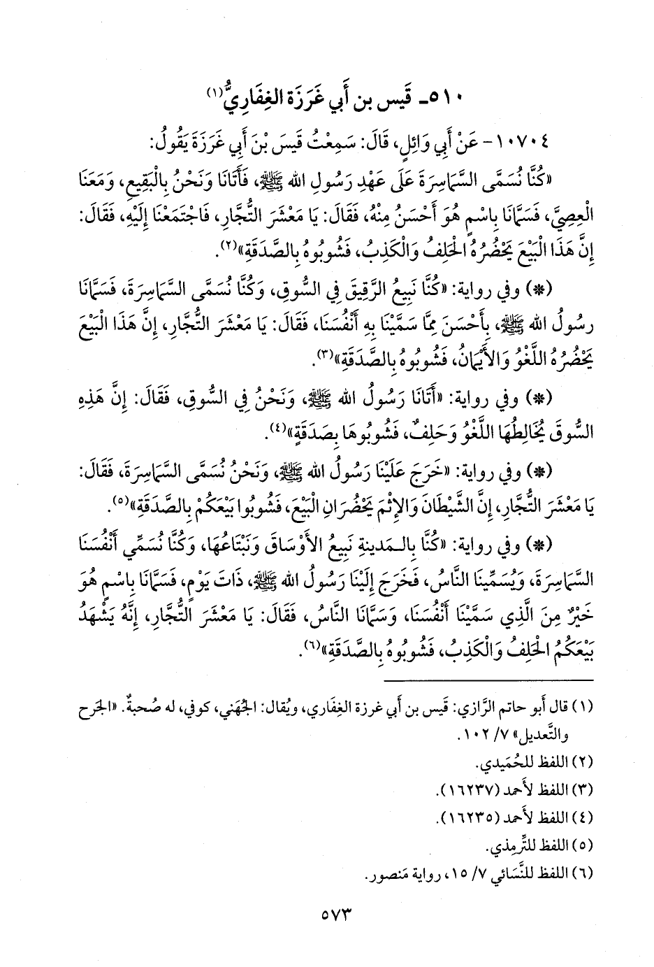 - وفي رواية: «كنا بالمدينة نبيع الأوساق ونبتاعها، وكنا نسمي أنفسنا السماسرة، ويسمينا الناس، فخرج إلينا رسول الله صَلى الله عَليه وسَلم ذات يوم، فسمانا باسم هو خير من الذي سمينا أنفسنا، وسمانا الناس، فقال: يا معشر التجار، إنه يشهد بيعكم الحلف والكذب، فشوبوه بالصدقة» (¬٦).