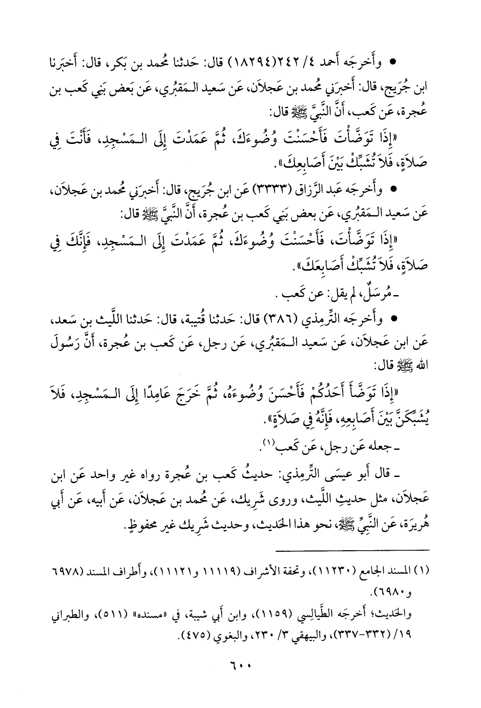 «أن رسول الله صَلى الله عَليه وسَلم قال لكعب بن عجرة: إذا توضأت، ثم دخلت المسجد، فلا تشبكن بين أصابعك».