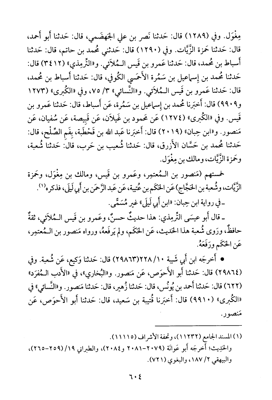 خمستهم (منصور بن المُعتَمِر، وعَمرو بن قيس، ومالك بن مِغْوَل، وحمزة الزيات، وشعبة بن الحجاج) عن الحكم بن عتيبة، عن عبد الرَّحمَن بن أبي ليلى، فذكره (¬١).