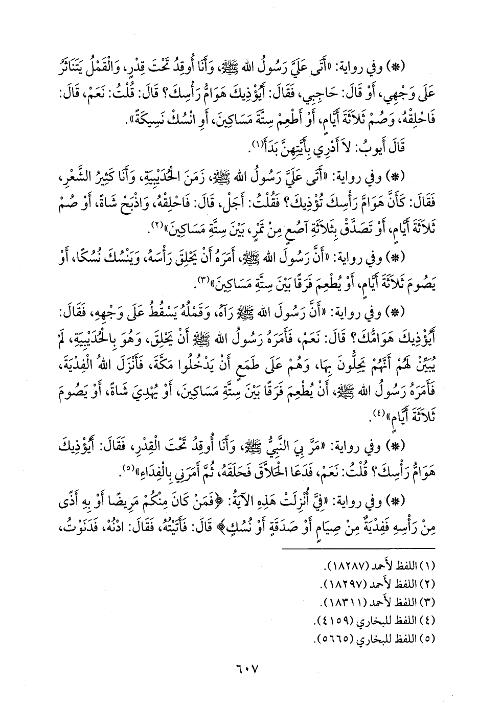 - وفي رواية: «أتى علي رسول الله صَلى الله عَليه وسَلم وأنا أوقد تحت قدر، والقمل يتناثر على وجهي، أو قال: حاجبي، فقال: أيؤذيك هوام رأسك؟ قال: قلت: نعم، قال: فاحلقه، وصم ثلاثة أيام، أو أطعم ستة مساكين، أو انسك نسيكة».