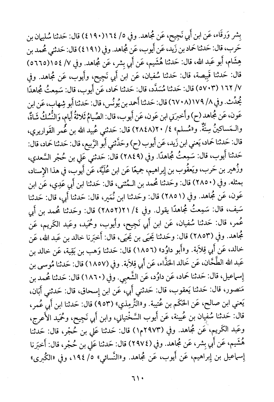 وفي ٧/ ١٥٤ (٥٦٦٥) قال: حدثنا قَبيصَة، قال: حدثنا سفيان، عن ابن أَبي نَجيح، وأيوب، عن مجاهد. وفي ٧/ ١٦٢ (٥٧٠٣) قال: حدثنا مُسدد، قال: حدثنا حماد، عن أيوب، قال: سمعت مجاهدا يحدث. وفي ٨/ ١٧٩ (٦٧٠٨) قال: حدثنا أحمد بن يونس، قال: حدثنا أَبو شهاب، عن ابن عَون، عن مجاهد (ح) وأخبرني ابن عَون، عن أيوب، قال: الصيام ثلاثة أيام، والنسك شاة، والمساكين ستة. و «مسلم» ٤/ ٢٠ (٢٨٤٨) قال: حدثني عُبيد الله بن عمر القواريري، قال: حدثنا حماد، يعني ابن زيد، عن أيوب (ح) وحدثني أَبو الربيع، قال: حدثنا حماد، قال: حدثنا أيوب، قال: سمعت مجاهدا. وفي (٢٨٤٩) قال: حدثني علي بن حُجْر السعدي، وزهير بن حرب، ويعقوب بن إبراهيم، جميعا عن ابن عُلَية، عن أيوب، في هذا الإسناد، بمثله. وفي (٢٨٥٠) قال: وحدثنا محمد بن المثنى، قال: حدثنا ابن أَبي عَدي، عن ابن عَون، عن مجاهد. وفي (٢٨٥١) قال: وحدثنا ابن نُمير، قال: حدثنا أبي، قال: حدثنا سيف، قال: سمعت مجاهدا يقول. وفي ٤/ ٢١ (٢٨٥٢) قال: وحدثنا محمد بن أبي عمر، قال: حدثنا سفيان، عن ابن أَبي نَجيح، وأيوب، وحميد، وعبد الكريم، عن مجاهد. وفي (٢٨٥٣) قال: وحدثنا يحيى بن يحيى، قال: أخبرنا خالد بن عبد الله، عن خالد، عن أبي قلابة. و «أَبو داود» (١٨٥٦) قال: حدثنا وهب بن بقية، عن خالد بن عبد الله الطحان، عن خالد الحَذَّاء، عن أبي قلابة. وفي (١٨٥٧) قال: حدثنا موسى بن إسماعيل، قال: حدثنا حماد، عن داود، عن الشعبي. وفي (١٨٦٠) قال: حدثنا محمد بن منصور، قال: حدثنا يعقوب، قال: حدثني أبي، عن ابن إسحاق، قال: حدثني أبان، يعني ابن صالح، عن الحكم بن عتيبة. و «التِّرمِذي» (٩٥٣) قال: حدثنا ابن أبي عمر، قال: حدثنا سفيان بن عُيينة، عن أيوب السَّخْتِياني، وابن أَبي نَجيح، وحميد الأعرج، وعبد الكريم، عن مجاهد. وفي (٢٩٧٣ م ١) قال: حدثنا علي بن حُجْر، قال: حدثنا هُشيم، عن أبي بشر، عن مجاهد. وفي (٢٩٧٤) قال: حدثنا علي بن حُجْر، قال: أخبرنا إسماعيل بن إبراهيم، عن أيوب، عن مجاهد. و «النَّسَائي» ٥/ ١٩٤، وفي «الكبرى»