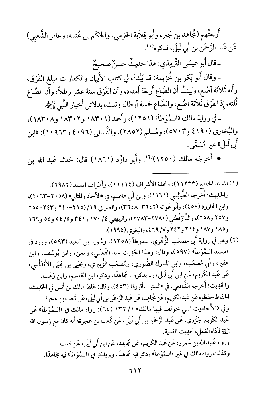 والحديث؛ أخرجه الشافعي في «السنن المأثورة» (٤٥٣)، وقال: غلط مالك بن أَنس في الحديث، الحفاظ حفظوه عن عبد الكريم، عن مجاهد، عن عبد الرَّحمَن بن أبي ليلى، عن كعب بن عجرة.