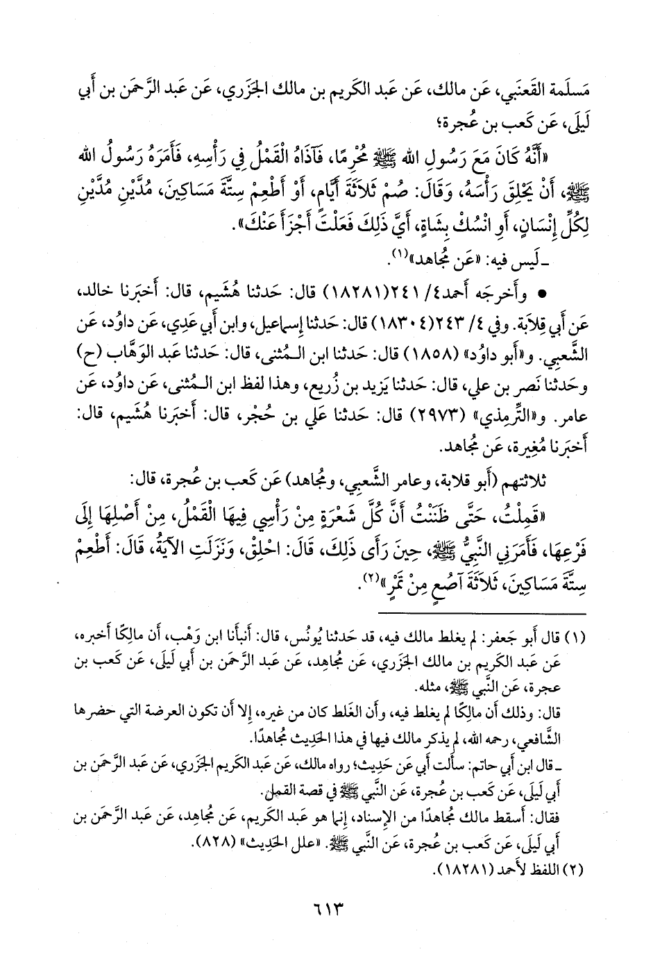 - قال ابن أبي حاتم: سألتُ أبي عن حديثٍ؛ رواه مالك، عن عبد الكريم الجزري، عن عبد الرَّحمَن بن أبي ليلى، عن كعب بن عجرة، عن النبي صَلى الله عَليه وسَلم في قصة القمل.