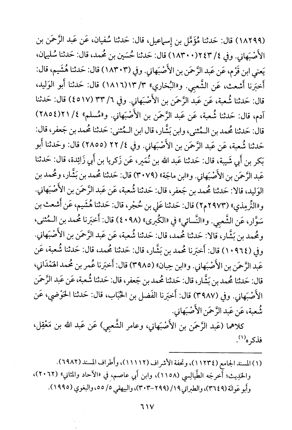 وفي ٦/ ٣٣ (٤٥١٧) قال: حدثنا آدم، قال: حدثنا شعبة، عن عبد الرَّحمَن بن الأصبهاني. و «مسلم» ٤/ ٢١ (٢٨٥٤) قال: حدثنا محمد بن المثنى، وابن بشار، قال ابن المثنى: حدثنا محمد بن جعفر، قال: حدثنا شعبة، عن عبد الرَّحمَن بن الأصبهاني. وفي ٤/ ٢٢ (٢٨٥٥) قال: وحدثنا أَبو بكر بن أبي شيبة، قال: حدثنا عبد الله بن نُمير، عن زكريا بن أبي زائدة، قال: حدثنا عبد الرَّحمَن بن الأصبهاني. و «ابن ماجة» (٣٠٧٩) قال: حدثنا محمد بن بشار، ومحمد بن الوليد، قالا: حدثنا محمد بن جعفر، قال: حدثنا شعبة، عن عبد الرَّحمَن بن الأصبهاني. و «التِّرمِذي» (٢٩٧٣ م ٢) قال: حدثنا علي بن حُجْر، قال: حدثنا هُشيم، عن أشعث بن سوار، عن الشعبي. و «النَّسَائي» في «الكبرى» (٤٠٩٨) قال: أخبرنا محمد بن المثنى، ومحمد بن بشار، قالا: حدثنا محمد، قال: حدثنا شعبة، عن عبد الرَّحمَن بن الأصبهاني. وفي (١٠٩٦٤) قال: أخبرنا محمد بن بشار، قال: حدثنا محمد، قال: حدثنا شعبة، عن عبد الرَّحمَن بن الأصبهاني. و «ابن حِبَّان» (٣٩٨٥) قال: أخبرنا عمر بن محمد الهمداني، قال: حدثنا محمد بن بشار، قال: حدثنا محمد بن جعفر، قال: حدثنا شعبة، عن عبد الرَّحمَن الأصبهاني. وفي (٣٩٨٧) قال: أخبرنا الفضل بن الحُبَاب، قال: حدثنا الحوضي، عن شعبة، عن عبد الرَّحمَن الأصبهاني.