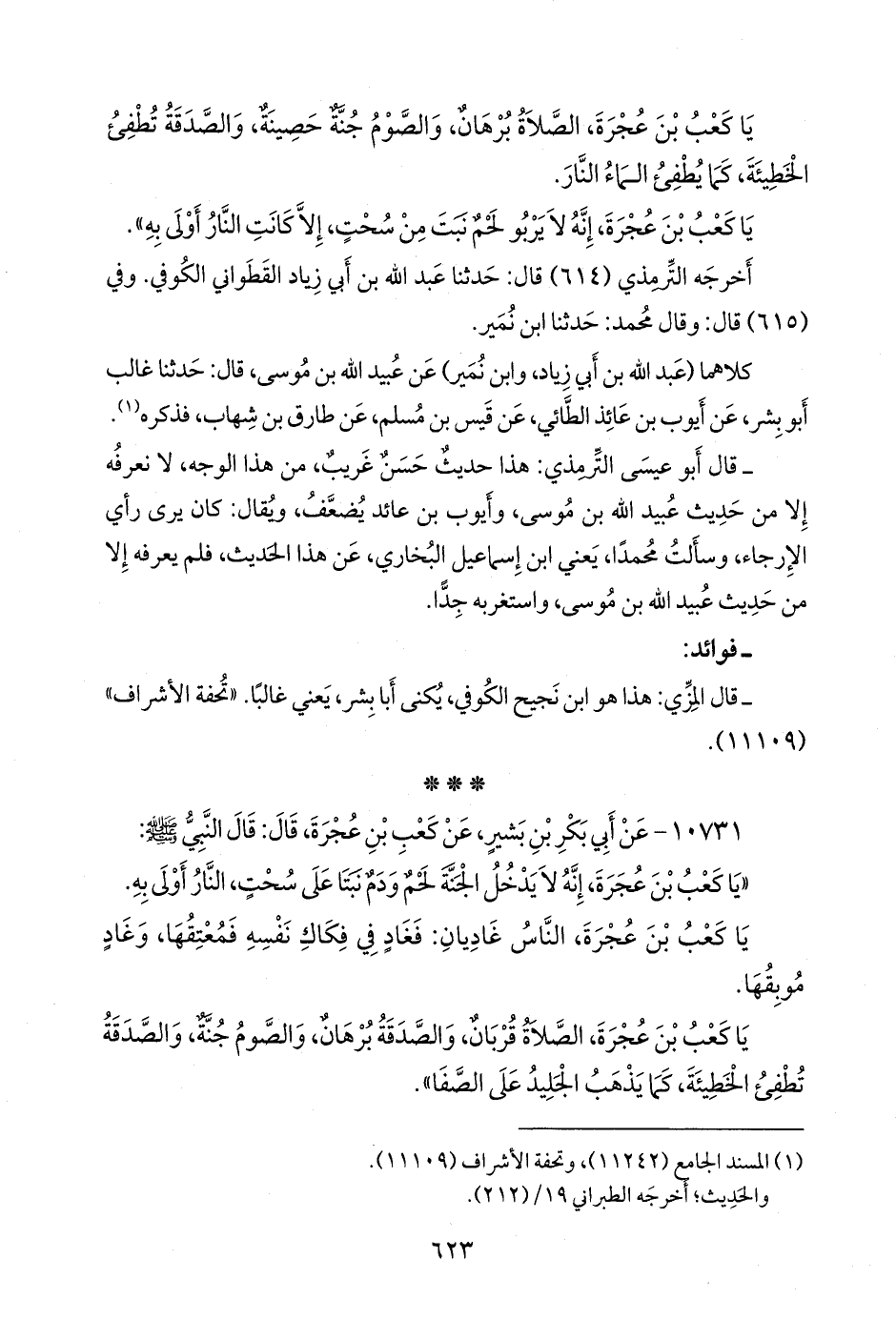 يا كعب بن عجرة، الصلاة قربان، والصدقة برهان، والصوم جنة، والصدقة تطفئ الخطيئة، كما يذهب الجليد على الصفا».