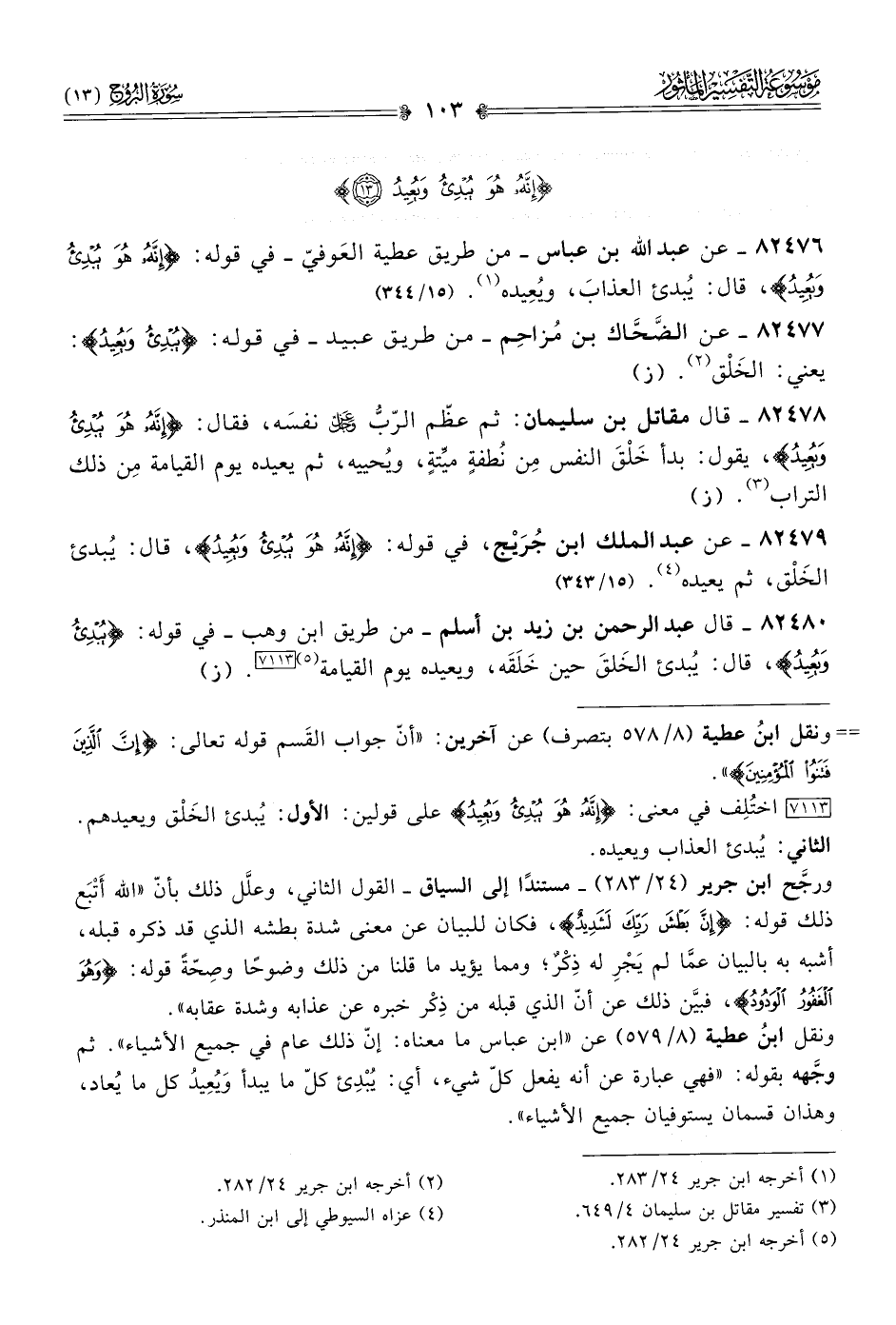 ٨٢٤٧٦ - عن عبد الله بن عباس -من طريق عطية العَوفيّ- في قوله: {إنَّهُ هُوَ يُبْدِئُ ويُعِيدُ}، قال: يُبدئ العذابَ، ويُعِيده (¬١). (١٥/ ٣٤٤)