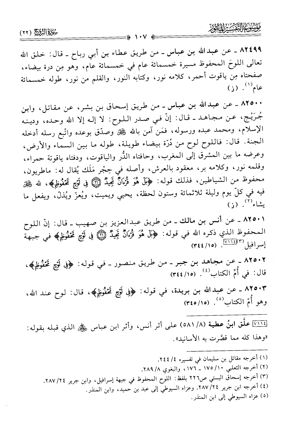 ٨٢٥٠١ - عن أنس بن مالك -من طريق عبد العزيز بن صهيب- قال: إنّ اللوح المحفوظ الذي ذكره الله في قوله: {بَلْ هُوَ قُرْآنٌ مَجِيدٌ فِي لَوْحٍ مَحْفُوظٍ} في جبهة إسرافيل (¬٣) [٧١١٤]. (١٥/ ٣٤٤)