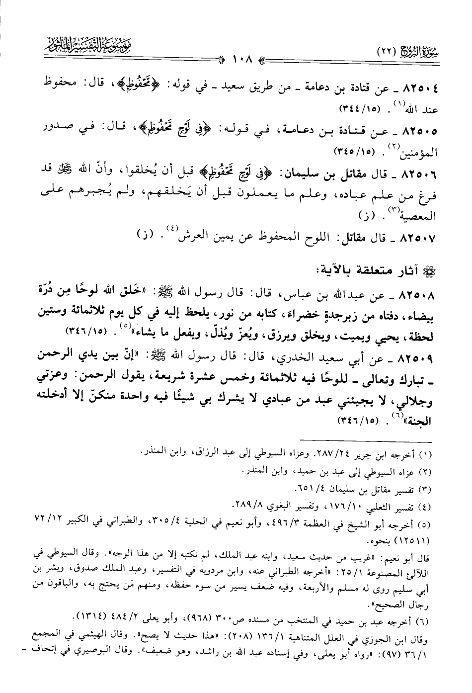 ٨٢٥٠٤ - عن قتادة بن دعامة -من طريق سعيد- في قوله: {مَحْفُوظٍ}، قال: محفوظ عند الله (¬١). (١٥/ ٣٤٤)