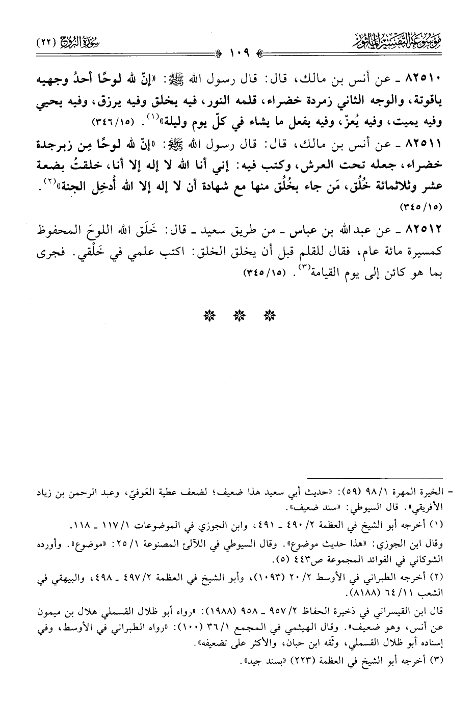 ٨٢٥١٢ - عن عبد الله بن عباس -من طريق سعيد- قال: خَلَق الله اللوحَ المحفوظ كمسيرة مائة عام، فقال للقلم قبل أن يخلق الخلق: اكتب علمي في خَلْقي. فجرى بما هو كائن إلى يوم القيامة (¬٣). (١٥/ ٣٤٥)