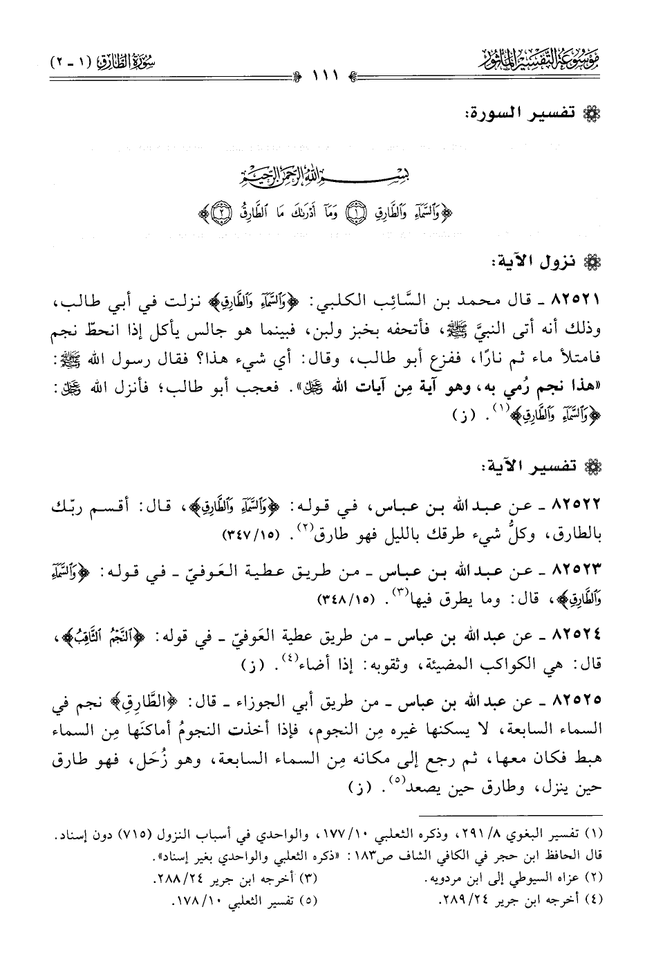 ٨٢٥٢٣ - عن عبد الله بن عباس -من طريق عطية العَوفيّ- في قوله: {والسَّماءِ والطّارِقِ}، قال: وما يطرق فيها (¬٣). (١٥/ ٣٤٨)