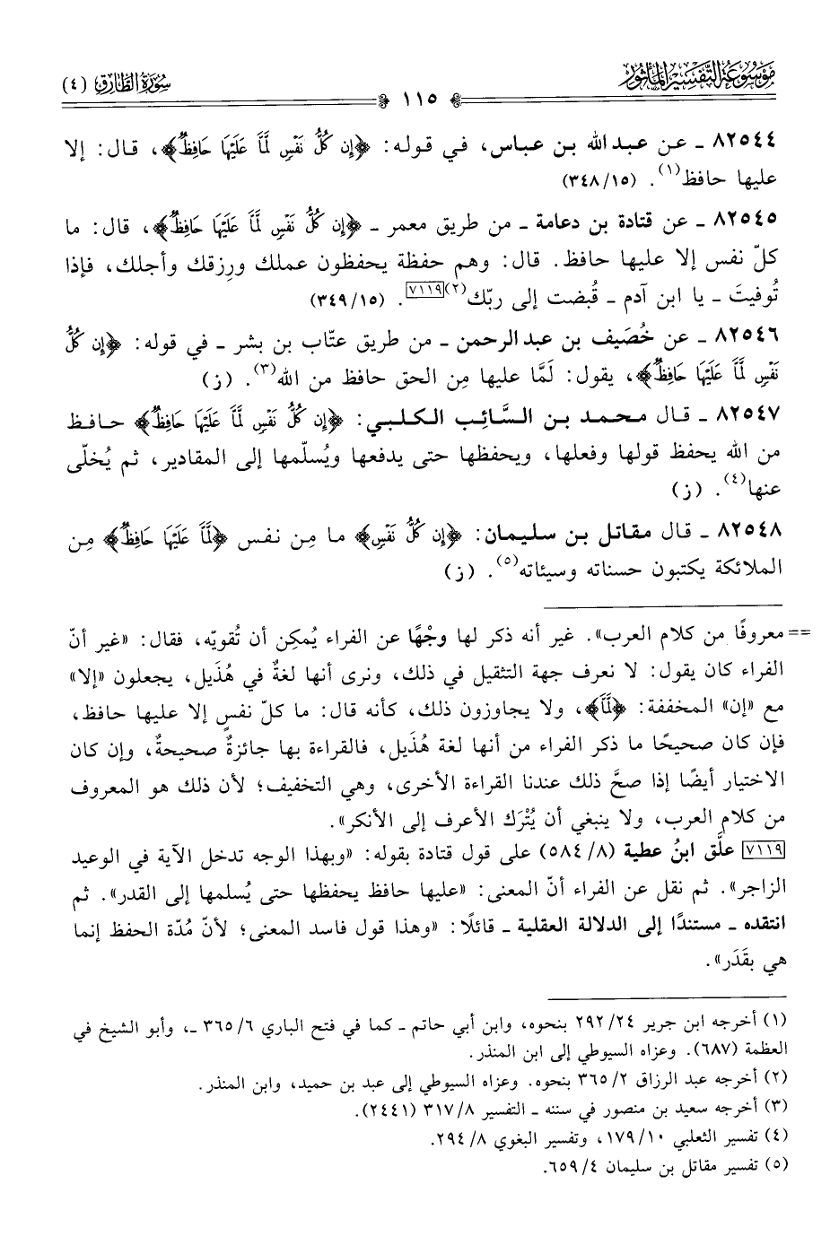 ٨٢٥٤٦ - عن خُصَيف بن عبد الرحمن -من طريق عتّاب بن بشر- في قوله: {إن كل نفس لما عليها حافظ}، يقول: لَمّا عليها مِن الحق حافظ من الله (¬٣). (ز)