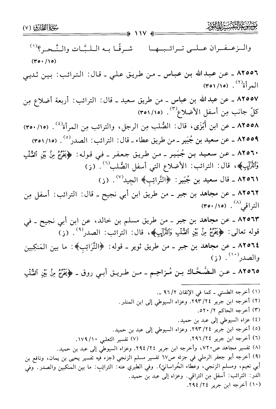 (¬٩) أخرجه أبو جعفر الرملي في جزئه ص ٦٧ تفسير مسلم الزنجي (جزء فيه تفسير يحيى بن يمان، ونافع بن أبي نعيم، ومسلم الزنجي، وعطاء الخُراسانيّ). وفي الطبري عنه: الترائِبِ: ما بين المنكبين والصدر. وفي الدر: الترائب: أسفل مِن التراقي. وعزاه إلى عبد بن حميد.