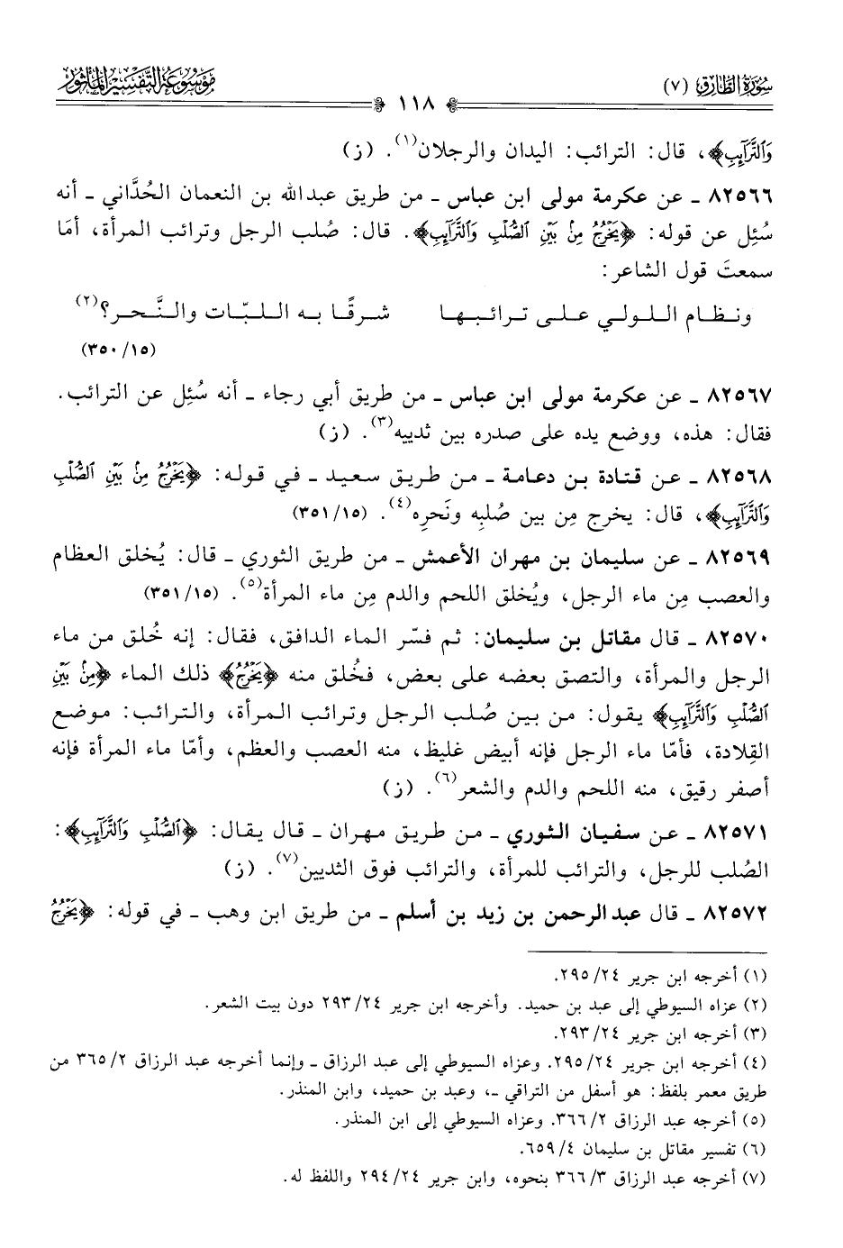 ٨٢٥٦٦ - عن عكرمة مولى ابن عباس -من طريق عبد الله بن النعمان الحُدّاني- أنه سُئِل عن قوله: {يَخْرُجُ مِن بَيْنِ الصُّلْبِ والتَّرائِبِ}. قال: صُلب الرجل وترائب المرأة، أما سمعتَ قول الشاعر: