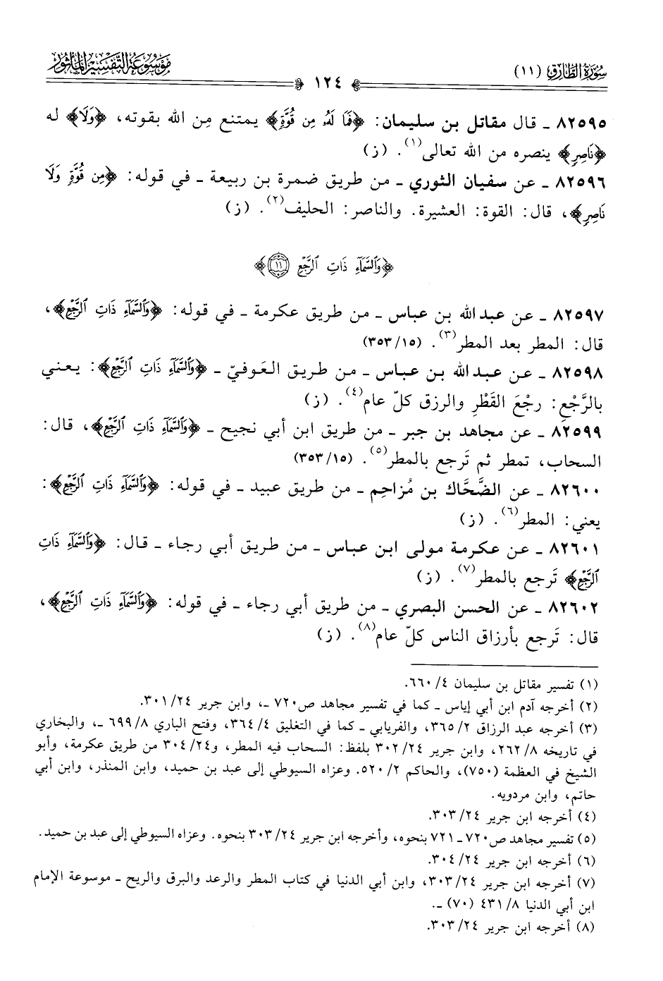 ٨٢٥٩٨ - عن عبد الله بن عباس -من طريق العَوفيّ- {والسَّماءِ ذاتِ الرَّجْعِ}: يعني بالرَّجْعِ: رجْعَ القَطْرِ والرزق كلّ عام (¬٤). (ز)