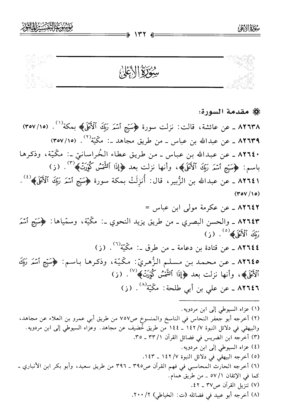 ٨٢٦٤٠ - عن عبد الله بن عباس -من طريق عطاء الخُراسانيّ-: مكّيّة، وذكرها باسم: {سَبِّحِ اسْمَ رَبِّكَ الأَعْلى}، وأنها نزلت بعد {إذا الشَّمْسُ كُوِّرَتْ} (¬٣). (ز)
