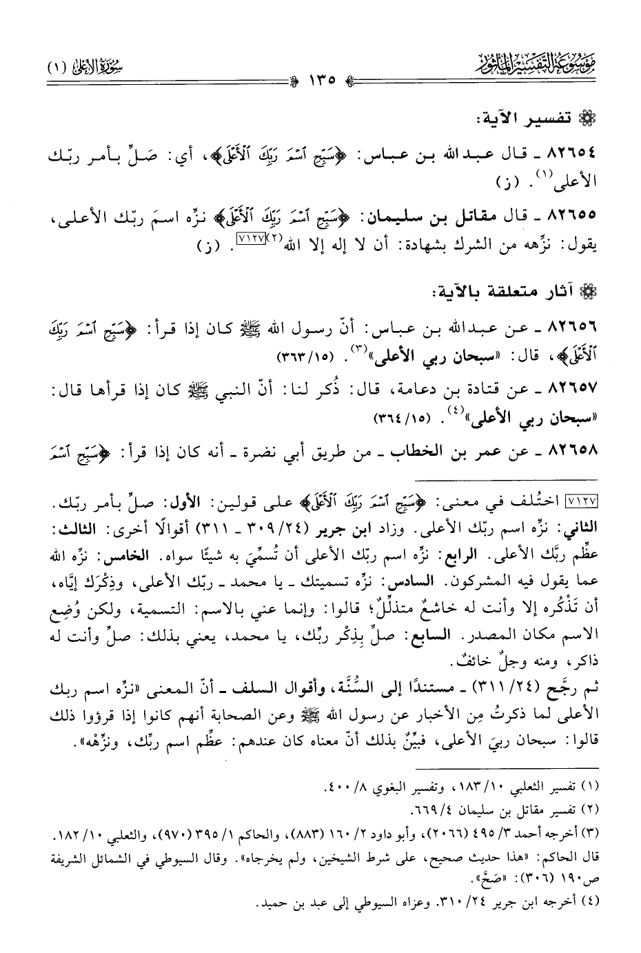 ٨٢٦٥٦ - عن عبد الله بن عباس: أنّ رسول الله - صلى الله عليه وسلم - كان إذا قرأ: {سَبِّحِ اسْمَ رَبِّكَ الأَعْلى}، قال: «سبحان ربي الأعلى» (¬٣). (١٥/ ٣٦٣)