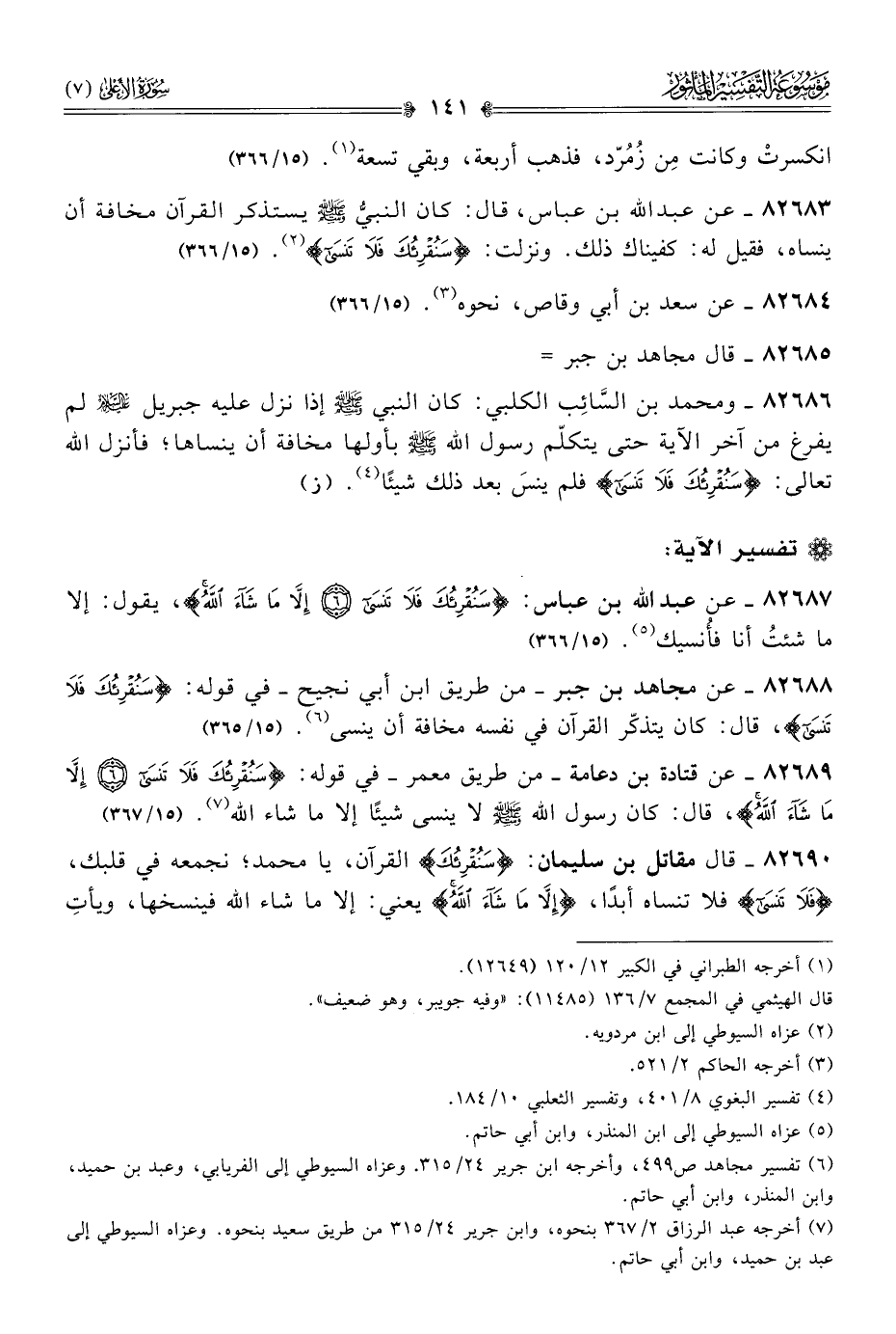 ٨٢٦٨٦ - ومحمد بن السّائِب الكلبي: كان النبي - صلى الله عليه وسلم - إذا نزل عليه جبريل - عليه السلام - لم يفرغ من آخر الآية حتى يتكلّم رسول الله - صلى الله عليه وسلم - بأولها مخافة أن ينساها؛ فأنزل الله تعالى: {سَنُقْرِئُكَ فَلا تَنْسى} فلم ينسَ بعد ذلك شيئًا (¬٤). (ز)