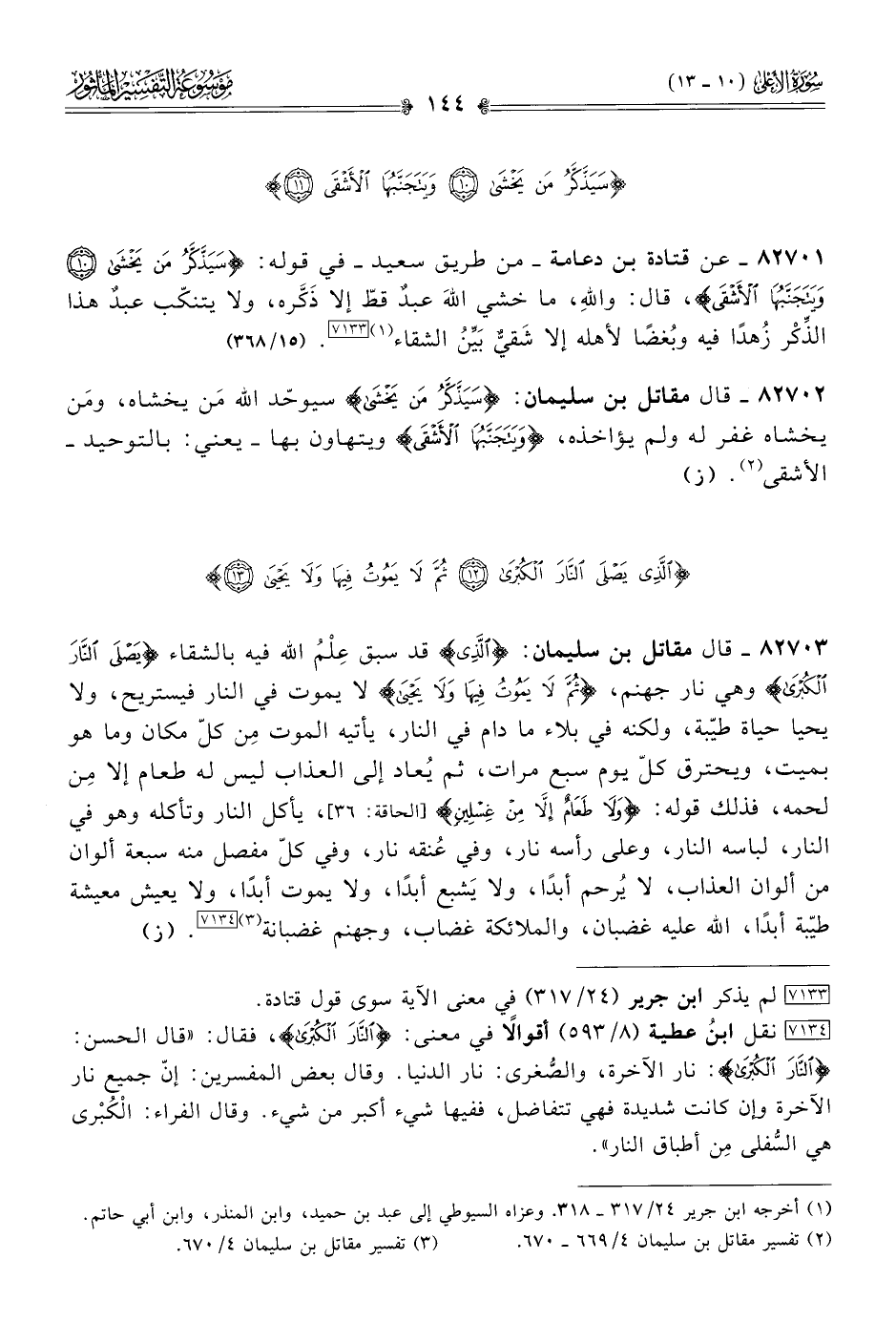 ٨٢٧٠٣ - قال مقاتل بن سليمان: {الَّذِي} قد سبق عِلْمُ الله فيه بالشقاء {الذي يَصْلى النّارَ الكُبْرى} وهي نار جهنم، {ثُمَّ لا يَمُوتُ فِيها ولا يَحْيى} لا يموت في النار فيستريح، ولا يحيا حياة طيّبة، ولكنه في بلاء ما دام في النار، يأتيه الموت مِن كلّ مكان وما هو بميت، ويحترق كلّ يوم سبع مرات، ثم يُعاد إلى العذاب ليس له طعام إلا مِن لحمه، فذلك قوله: {ولا طَعامٌ إلّا مِن غِسْلِينٍ} [الحاقة: ٣٦]، يأكل النار وتأكله وهو في النار، لباسه النار، وعلى رأسه نار، وفي عُنقه نار، وفي كلّ مفصل منه سبعة ألوان من ألوان العذاب، لا يُرحم أبدًا، ولا يَشبع أبدًا، ولا يموت أبدًا، ولا يعيش معيشة طيّبة أبدًا، الله عليه غضبان، والملائكة غضاب، وجهنم غضبانة (¬٣) [٧١٣٤]. (ز)