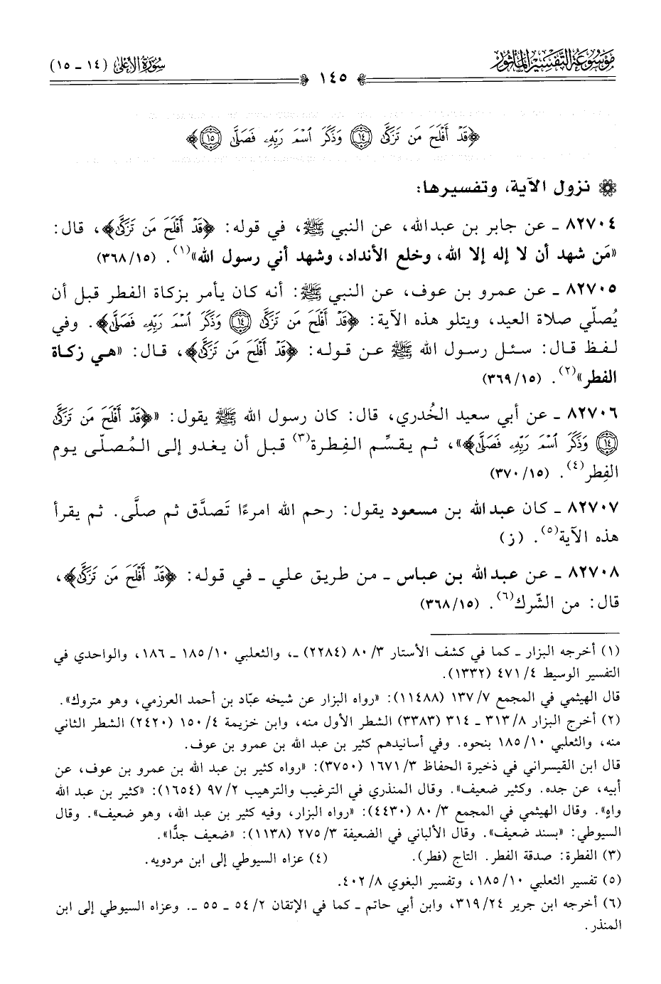 ٨٢٧٠٦ - عن أبي سعيد الخُدري، قال: كان رسول الله - صلى الله عليه وسلم - يقول: {قَدْ أفْلَحَ مَن تَزَكّى وذَكَرَ اسْمَ رَبِّهِ فَصَلّى}، ثم يقسِّم الفِطرة (¬٣) قبل أن يغدو إلى المُصلّى يوم الفِطر (¬٤). (١٥/ ٣٧٠)