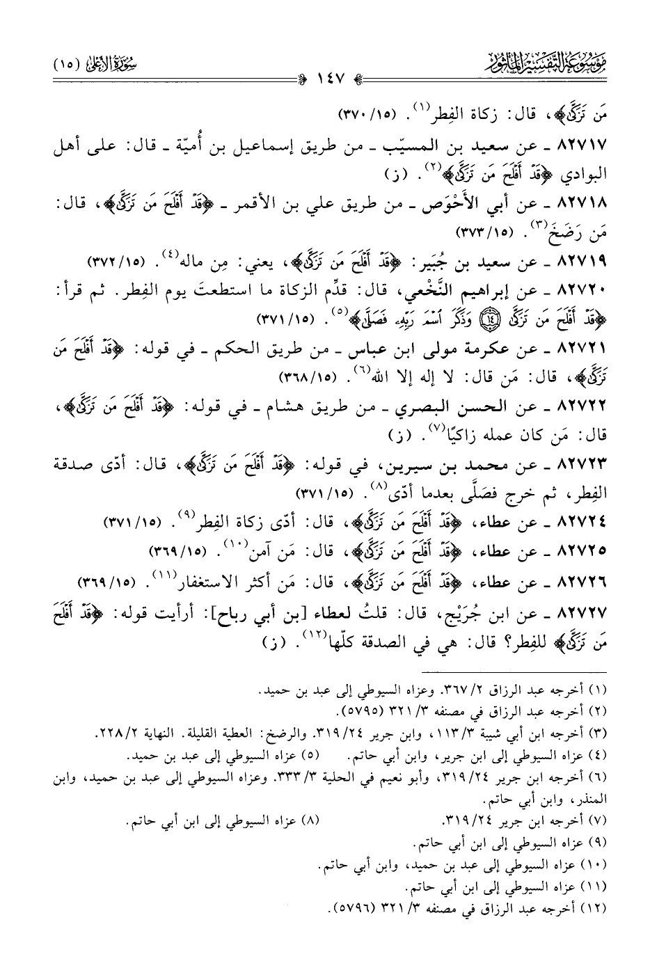 ٨٢٧١٩ - عن سعيد بن جُبَير: {قَدْ أفْلَحَ مَن تَزَكّى}، يعني: مِن ماله (¬٤). (١٥/ ٣٧٢)
