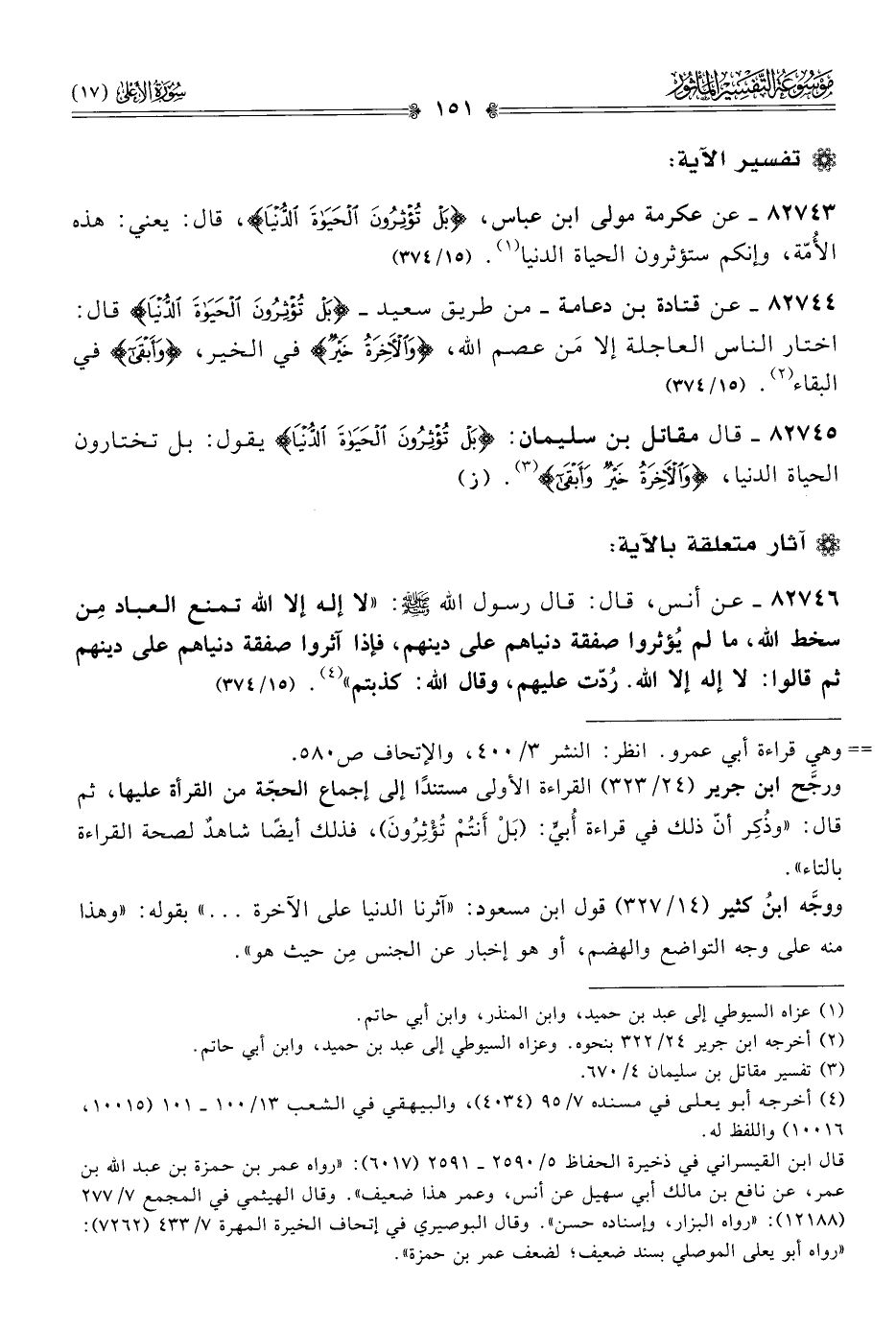 ٨٢٧٤٥ - قال مقاتل بن سليمان: {بَلْ تُؤْثِرُونَ الحَياةَ الدُّنْيا} يقول: بل تختارون الحياة الدنيا، {والآخِرَةُ خَيْرٌ وأَبْقى} (¬٣). (ز)
