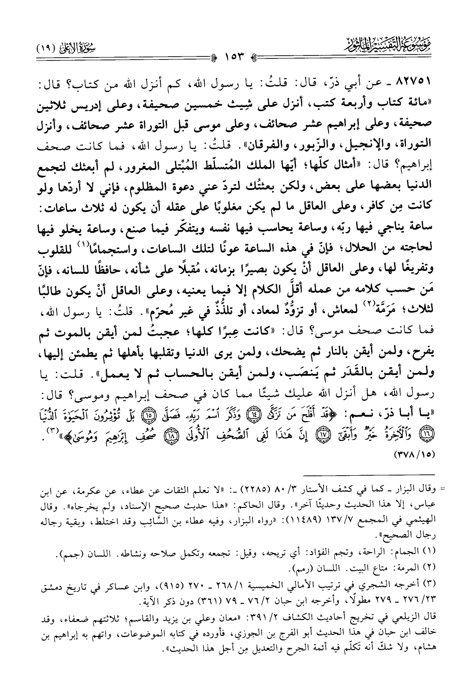 ٨٢٧٥١ - عن أبي ذرّ، قال: قلتُ: يا رسول الله، كم أنزل الله من كتاب؟ قال: «مائة كتاب وأربعة كتب، أنزل على شِيث خمسين صحيفة، وعلى إدريس ثلاثين صحيفة، وعلى إبراهيم عشر صحائف، وعلى موسى قبل التوراة عشر صحائف، وأنزل التوراة، والإنجيل، والزّبور، والفرقان». قلتُ: يا رسول الله، فما كانت صحف إبراهيم؟ قال: «أمثال كلّها؛ أيّها الملك المُتسلّط المُبْتلى المغرور، لم أبعثك لتجمع الدنيا بعضها على بعض، ولكن بعثتُك لتردّ عني دعوة المظلوم، فإني لا أردّها ولو كانت مِن كافر، وعلى العاقل ما لم يكن مغلوبًا على عقله أن يكون له ثلاث ساعات: ساعة يناجي فيها ربّه، وساعة يحاسب فيها نفسه ويتفكّر فيما صنع، وساعة يخلو فيها لحاجته من الحلال؛ فإنّ في هذه الساعة عونًا لتلك الساعات، واستجمامًا (¬١) للقلوب وتفريغًا لها، وعلى العاقل أنْ يكون بصيرًا بزمانه، مُقبلًا على شأنه، حافظًا للسانه، فإنّ مَن حسب كلامه من عمله أقلَّ الكلام إلا فيما يعنيه، وعلى العاقل أنْ يكون طالبًا لثلاث؛ مَرَمَّة (¬٢) لمعاش، أو تزوُّدٌ لمعاد، أو تلذُّذٌ في غير مُحرّم». قلتُ: يا رسول الله، فما كانت صحف موسى؟ قال: «كانت عِبرًا كلها؛ عجبتُ لمن أيقن بالموت ثم يفرح، ولمن أيقن بالنار ثم يضحك، ولمن يرى الدنيا وتقلبها بأهلها ثم يطمئن إليها، ولمن أيقن بالقَدَر ثم يَنصَب، ولمن أيقن بالحساب ثم لا يعمل». قلت: يا رسول الله، هل أنزل الله عليك شيئًا مما كان في صحف إبراهيم وموسى؟ قال: «يا أبا ذرّ، نعم: {قَدْ أفْلَحَ مَن تَزَكّى وذَكَرَ اسْمَ رَبِّهِ فَصَلّى بَلْ تُؤْثِرُونَ الحَياةَ الدُّنْيا والآخِرَةُ خَيْرٌ وأَبْقى إنَّ هَذا لَفِي الصُّحُفِ الأُولى صُحُفِ إبْراهِيمَ ومُوسى}» (¬٣). (١٥/ ٣٧٨)