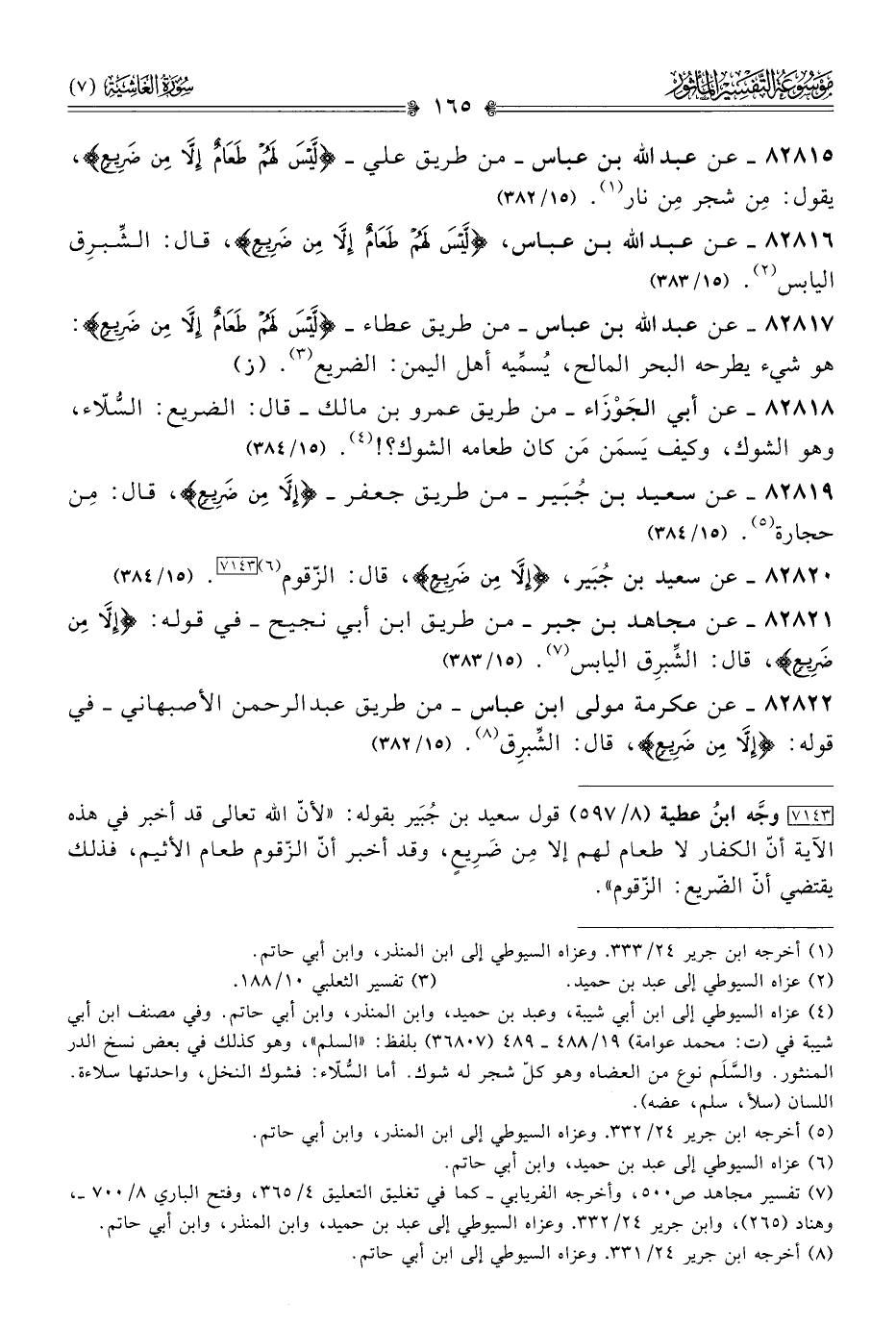 [٧١٤٣] وجَّه ابنُ عطية (٨/ ٥٩٧) قول سعيد بن جُبَير بقوله: «لأنّ الله تعالى قد أخبر في هذه الآية أنّ الكفار لا طعام لهم إلا مِن ضَرِيعٍ، وقد أخبر أنّ الزّقوم طعام الأثيم، فذلك يقتضي أنّ الضّريع: الزّقوم».