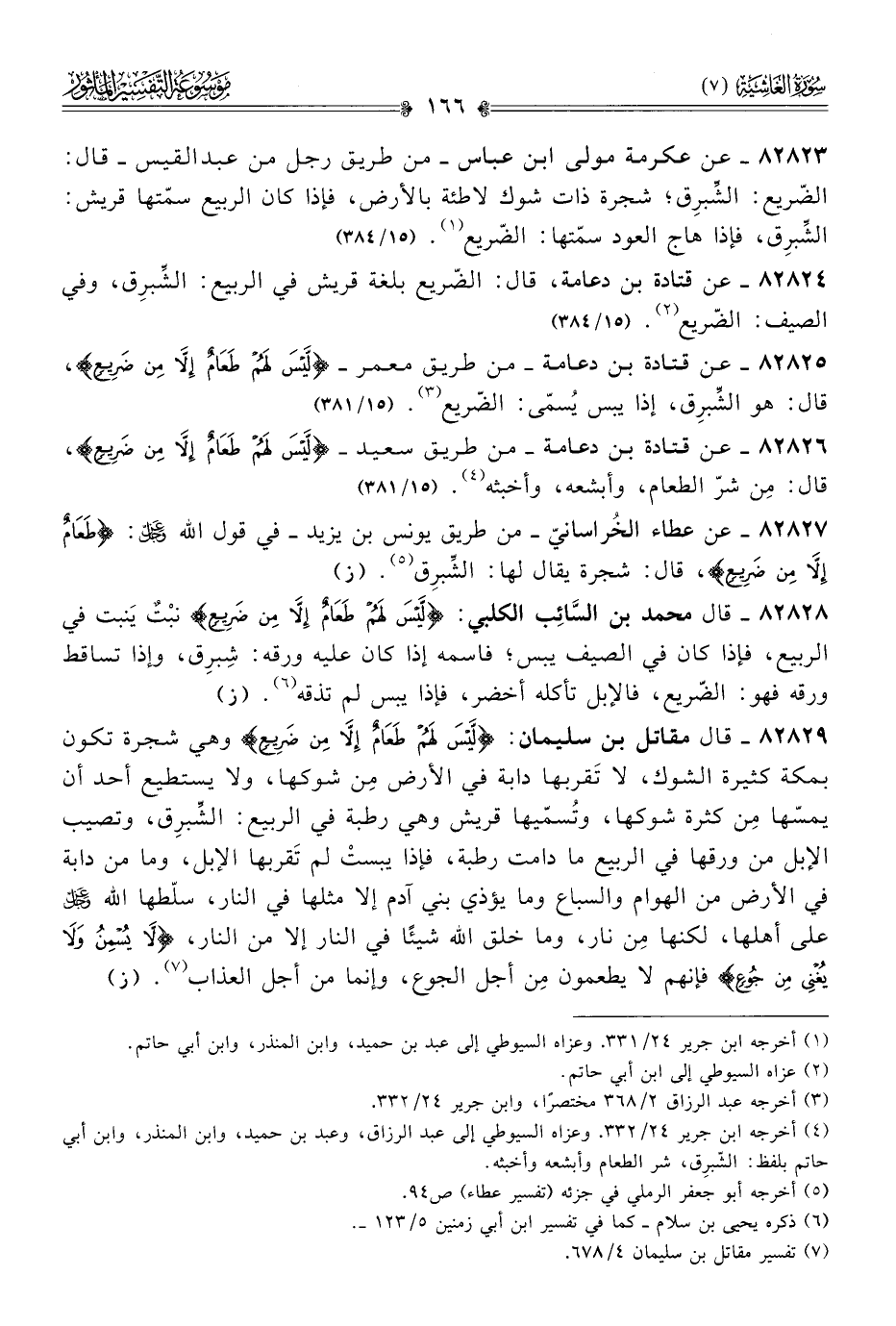 ٨٢٨٢٦ - عن قتادة بن دعامة -من طريق سعيد- {لَيْسَ لَهُمْ طَعامٌ إلّا مِن ضَرِيعٍ}، قال: مِن شرّ الطعام، وأبشعه، وأخبثه (¬٤). (١٥/ ٣٨١)