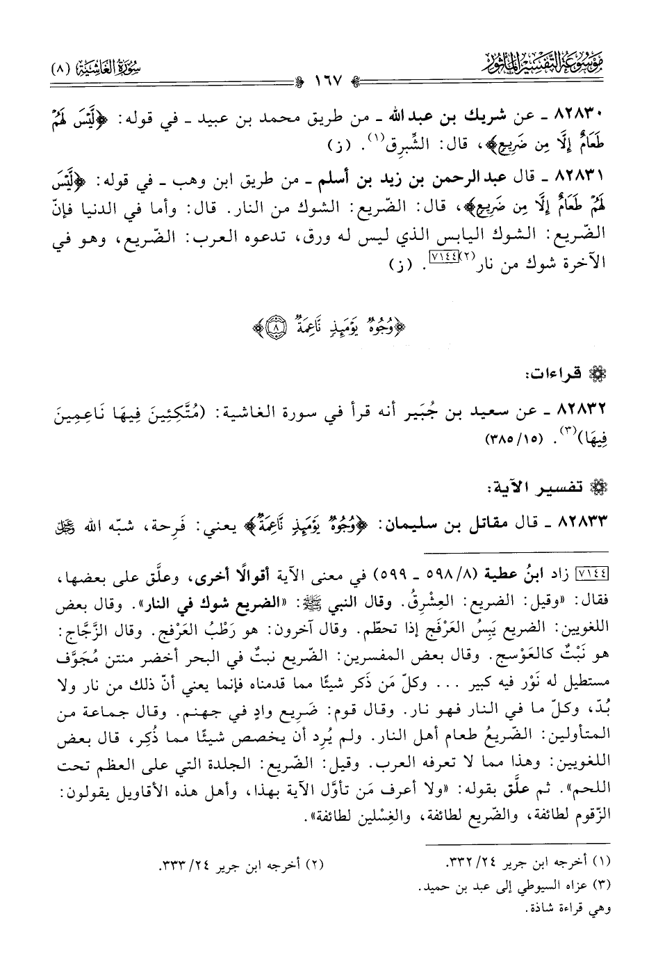 [٧١٤٤] زاد ابنُ عطية (٨/ ٥٩٨ - ٥٩٩) في معنى الآية أقوالًا أخرى، وعلَّق على بعضها، فقال: «وقيل: الضريع: العِشْرِقُ. وقال النبي - صلى الله عليه وسلم -: «الضريع شوك في النار». وقال بعض اللغويين: الضريع يَبِسُ العَرْفَج إذا تحطّم. وقال آخرون: هو رَطْبُ العَرْفج. وقال الزَّجّاج: هو نَبْتٌ كالعَوْسج. وقال بعض المفسرين: الضّريع نبتٌ في البحر أخضر منتن مُجَوَّف مستطيل له نَوْر فيه كبير ... وكلّ مَن ذَكر شيئًا مما قدمناه فإنما يعني أنّ ذلك من نار ولا بُدّ، وكلّ ما في النار فهو نار. وقال قوم: ضَرِيع وادٍ في جهنم. وقال جماعة من المتأولين: الضّريعُ طعام أهل النار. ولم يُرِد أن يخصص شيئًا مما ذُكِر، قال بعض اللغويين: وهذا مما لا تعرفه العرب. وقيل: الضّريع: الجلدة التي على العظم تحت اللحم». ثم علَّق بقوله: «ولا أعرف مَن تأوَّل الآية بهذا، وأهل هذه الأقاويل يقولون: الزّقوم لطائفة، والضّريع لطائفة، والغِسْلين لطائفة».