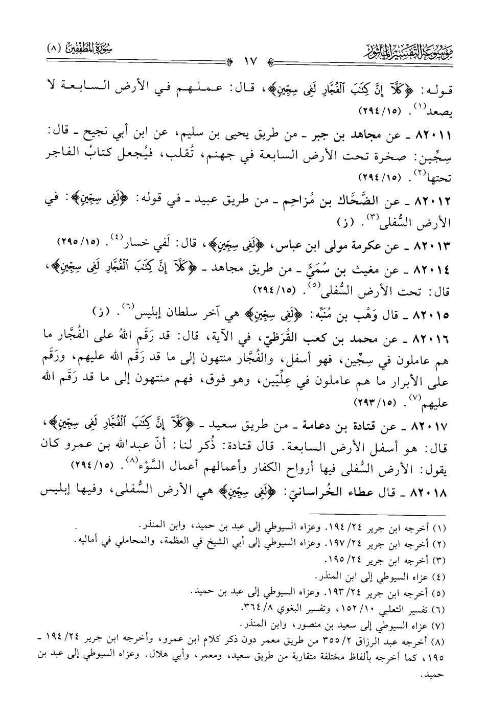 ٨٢٠١٧ - عن قتادة بن دعامة -من طريق سعيد- {كَلّا إنَّ كِتابَ الفُجّارِ لَفِي سِجِّين}، قال: هو أسفل الأرض السابعة. قال قتادة: ذُكر لنا: أنّ عبد الله بن عمرو كان يقول: الأرض السُّفلى فيها أرواح الكفار وأعمالهم أعمال السَّوْء (¬٨). (١٥/ ٢٩٤)