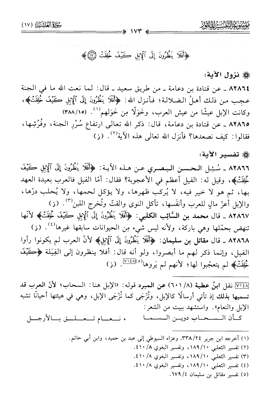 ٨٢٨٦٤ - عن قتادة بن دعامة -من طريق سعيد- قال: لما نعت الله ما في الجنة عجِب من ذلك أهلُ الضلالة؛ فأنزل الله: {أفَلا يَنْظُرُونَ إلى الإبِلِ كَيْفَ خُلِقَتْ}، وكانت الإبل عيشًا من عيش العرب، وخَوَلًا مِن خَوَلهم (¬١). (١٥/ ٣٨٨)