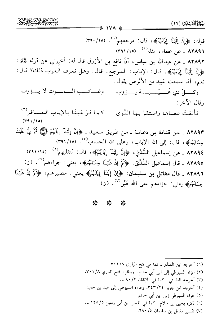 ٨٢٨٩٣ - عن قتادة بن دعامة -من طريق سعيد- {إنَّ إلَيْنا إيابَهُمْ ثُمَّ إنَّ عَلَيْنا حِسابَهُمْ}، قال: إلى الله الإياب، وعلى الله الحساب (¬٤). (١٥/ ٣٩١)