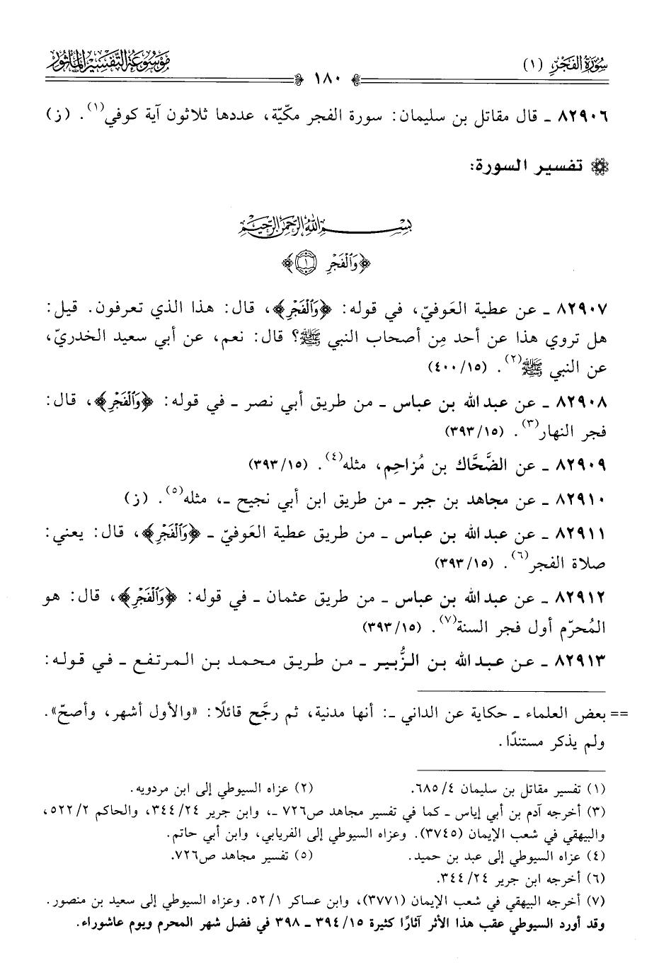 ٨٢٩٠٨ - عن عبد الله بن عباس -من طريق أبي نصر- في قوله: {والفَجْرِ}، قال: فجر النهار (¬٣). (١٥/ ٣٩٣)