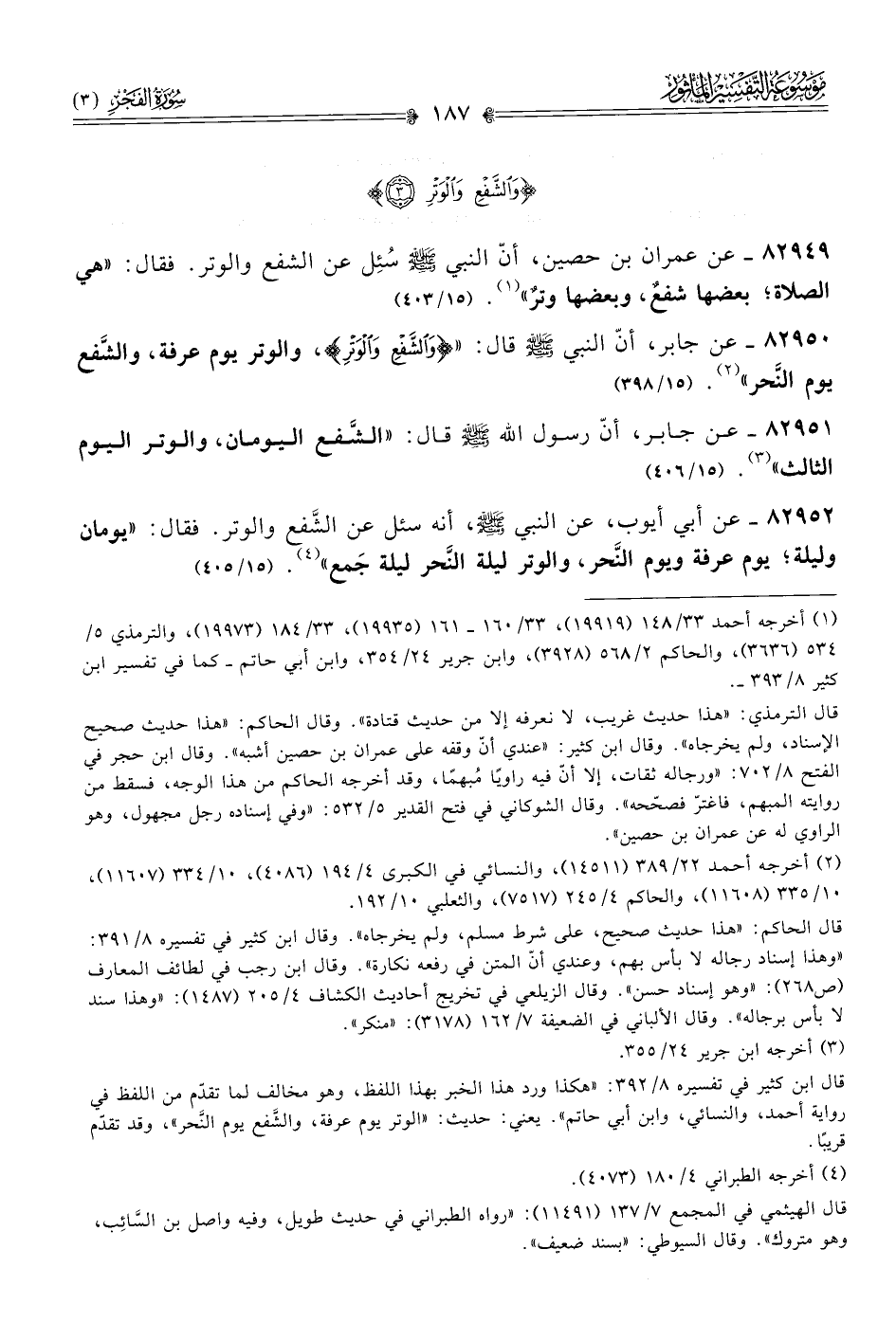 قال ابن كثير في تفسيره ٨/ ٣٩٢: «هكذا ورد هذا الخبر بهذا اللفظ، وهو مخالف لما تقدّم من اللفظ في رواية أحمد، والنسائي، وابن أبي حاتم». يعني: حديث: «الوتر يوم عرفة، والشَّفع يوم النَّحر»، وقد تقدّم قريبًا.