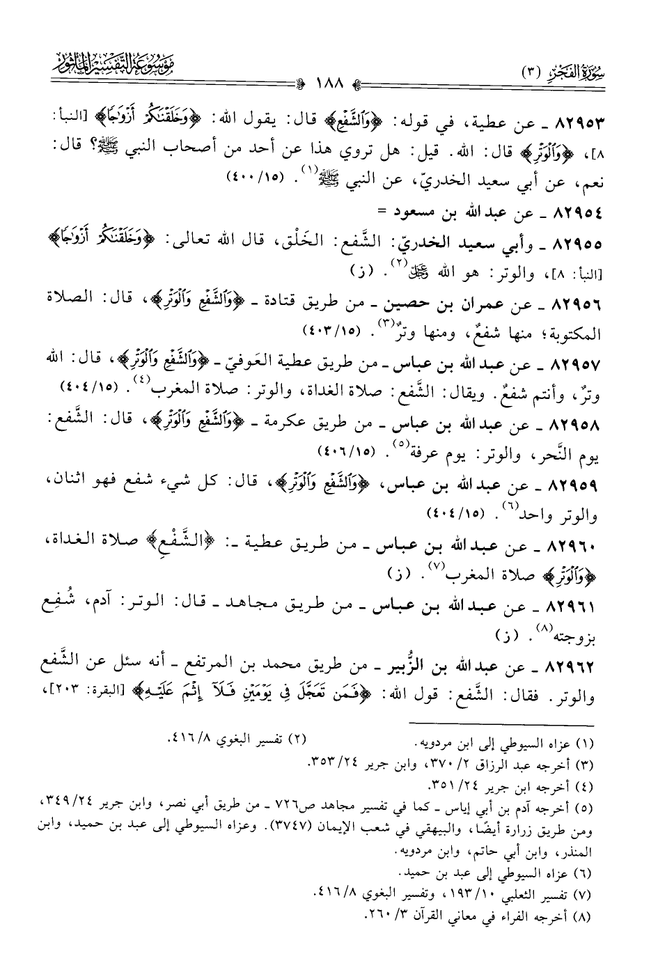 ٨٢٩٥٣ - عن عطية، في قوله: {والشَّفْعِ} قال: يقول الله: {وخَلَقْناكُمْ أزْواجًا} [النبأ: ٨]، {والوَتْرِ} قال: الله. قيل: هل تروي هذا عن أحد من أصحاب النبي - صلى الله عليه وسلم -؟ قال: نعم، عن أبي سعيد الخدريّ، عن النبي - صلى الله عليه وسلم - (¬١). (١٥/ ٤٠٠)