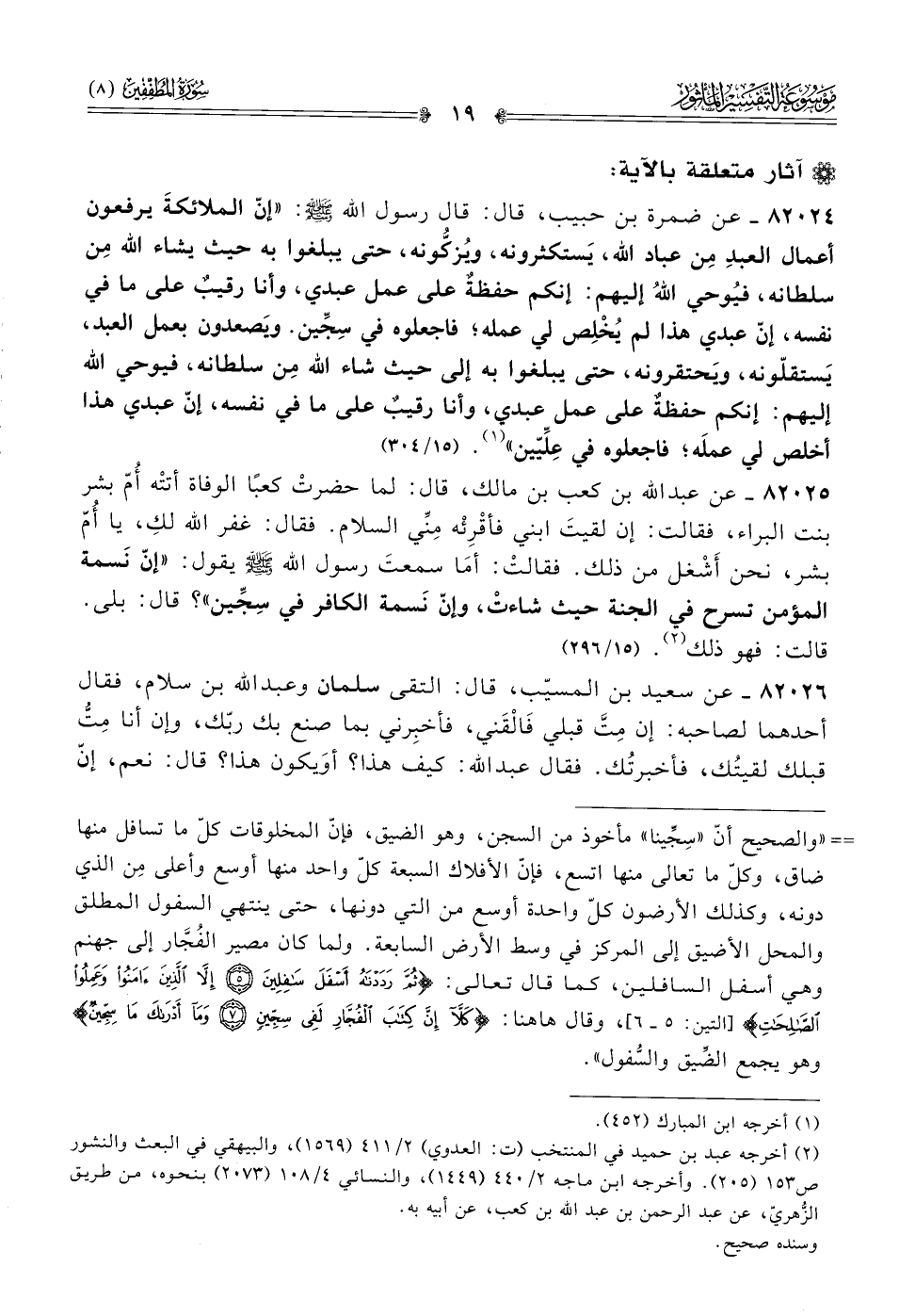 ٨٢٠٢٤ - عن ضمرة بن حبيب، قال: قال رسول الله - صلى الله عليه وسلم -: «إنّ الملائكةَ يرفعون أعمال العبدِ مِن عباد الله، يَستكثرونه، ويُزكُّونه، حتى يبلغوا به حيث يشاء الله مِن سلطانه، فيُوحي اللهُ إليهم: إنكم حفظةٌ على عمل عبدي، وأنا رقيبٌ على ما في نفسه، إنّ عبدي هذا لم يُخْلِص لي عمله؛ فاجعلوه في سِجِّين. ويَصعدون بعمل العبد، يَستقلّونه، ويَحتقرونه، حتى يبلغوا به إلى حيث شاء الله مِن سلطانه، فيوحي الله إليهم: إنكم حفظةٌ على عمل عبدي، وأنا رقيبٌ على ما في نفسه، إنّ عبدي هذا أخلص لي عملَه؛ فاجعلوه في عِلِّيّين» (¬١). (١٥/ ٣٠٤)