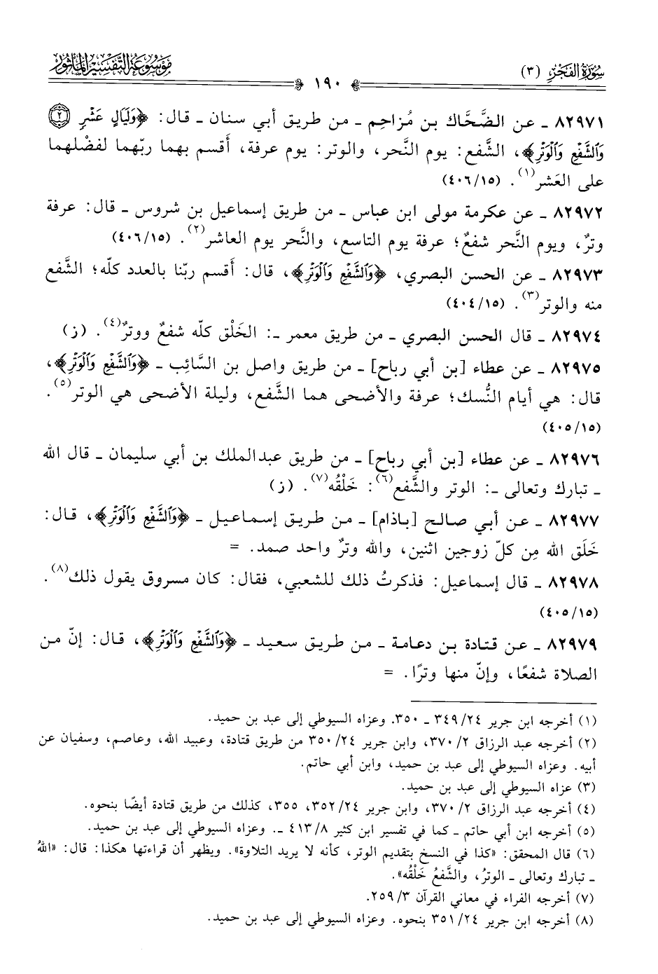 ٨٢٩٧١ - عن الضَّحّاك بن مُزاحِم -من طريق أبي سنان- قال: {ولَيالٍ عَشْرٍ والشَّفْعِ والوَتْرِ}، الشَّفع: يوم النَّحر، والوتر: يوم عرفة، أقسم بهما ربّهما لفضْلهما على العَشر (¬١). (١٥/ ٤٠٦)