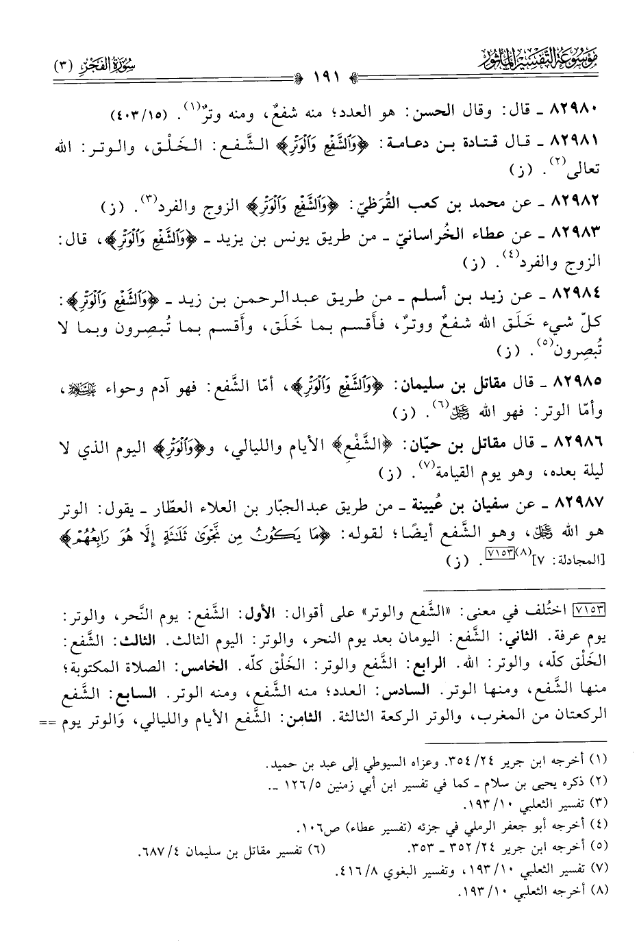 ٨٢٩٨١ - قال قتادة بن دعامة: {والشَّفْعِ والوَتْرِ} الشَّفع: الخَلْق، والوتر: الله تعالى (¬٢). (ز)