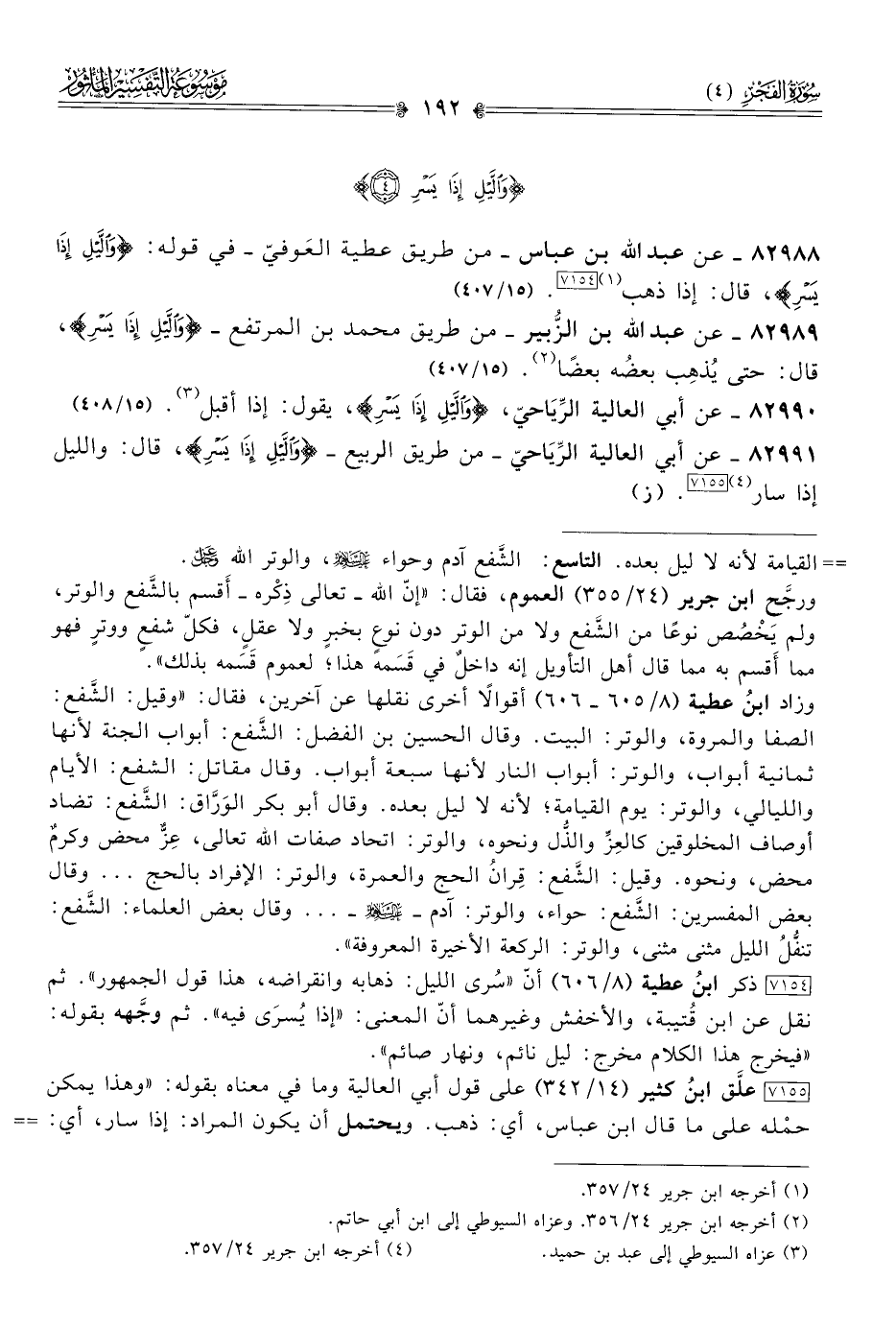 ٨٢٩٨٨ - عن عبد الله بن عباس -من طريق عطية العَوفيّ- في قوله: {واللَّيْلِ إذا يَسْرِ}، قال: إذا ذهب (¬١) [٧١٥٤]. (١٥/ ٤٠٧)