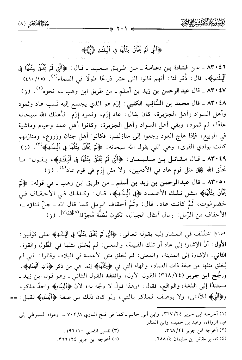 [٧١٥٩] اختُلف في المشار إليه بقوله تعالى: {الَّتِي لَمْ يُخْلَقْ مِثْلُها فِي البِلادِ} على قولين: الأول: أنّ الإشارة إلى عاد أو تلك القبيلة، والمعنى: لم يُخلق مثلها في الطُّول والقوة. الثاني: الإشارة إلى المدينة، والمعنى: لم يُخلق مثل الأعمدة في البلاد، وقالوا: التي لم يُخلق مثلها من صفة ذات العماد، والهاء التي في {مثلُها} إنما هي من ذكر {ذات العماد}.
